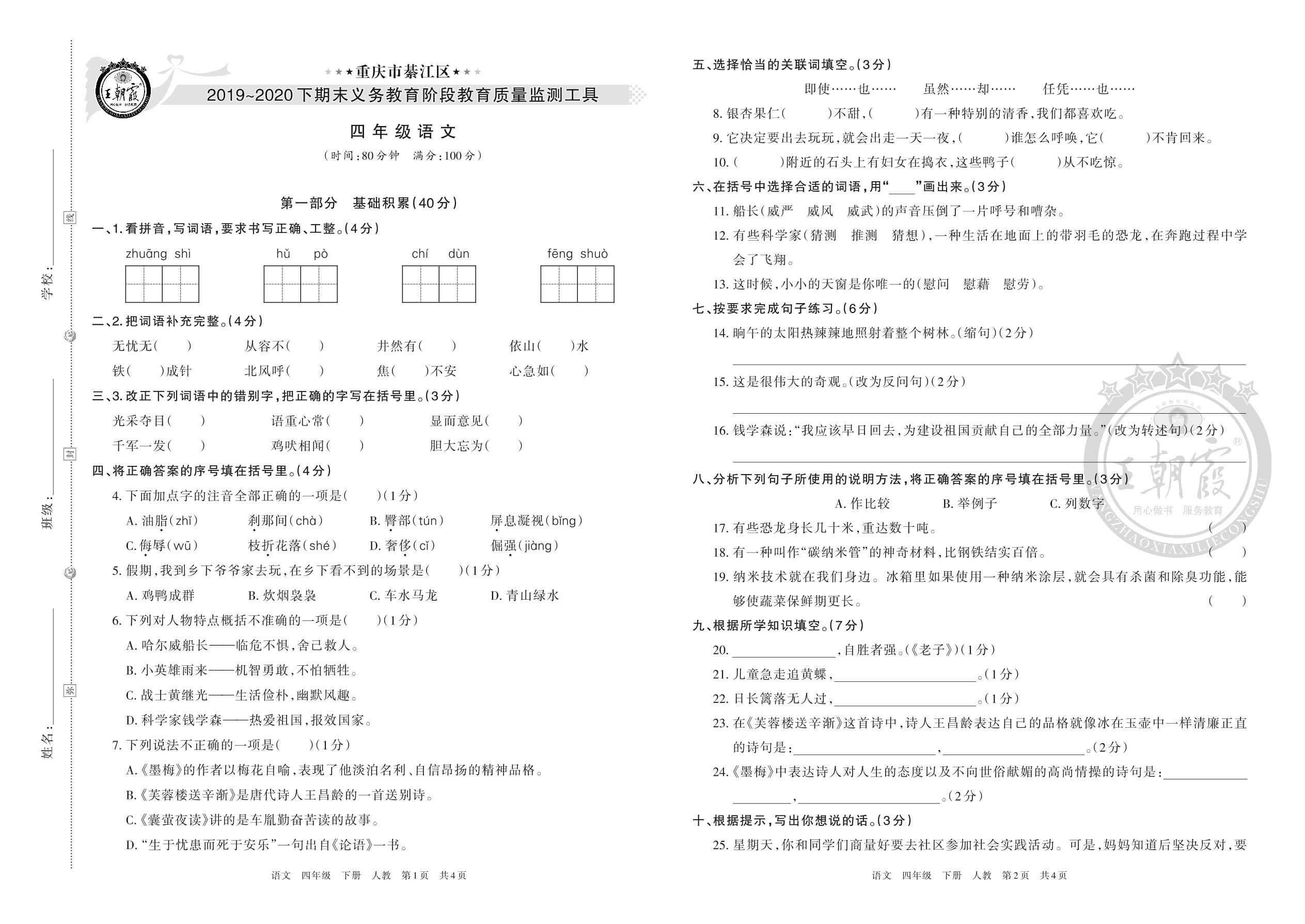 重庆市綦江区2019~2020下期末义务教育阶段教育质量监测工具四年级语文(人教版)