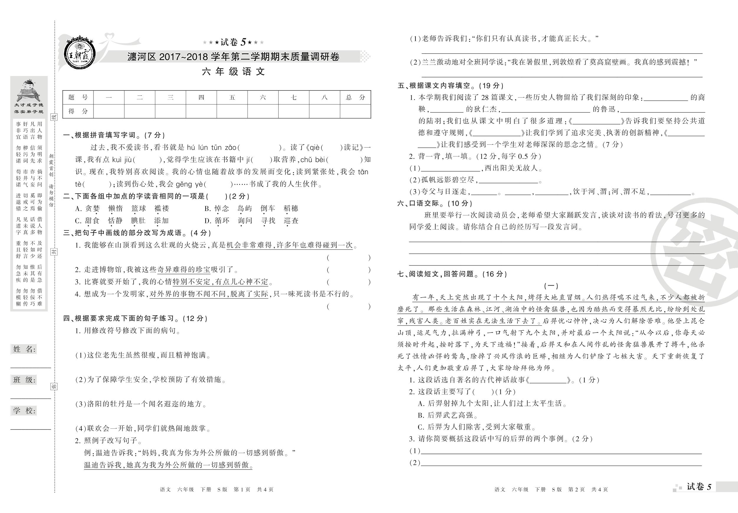 2017-2018学年第二学期洛阳市瀍河区六年级语文试卷(S版)【5】