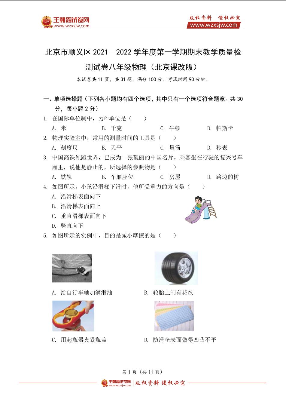 北京市顺义区2021—2022学年度第一学期期末教学质量检测试卷八年级物理(北京版)