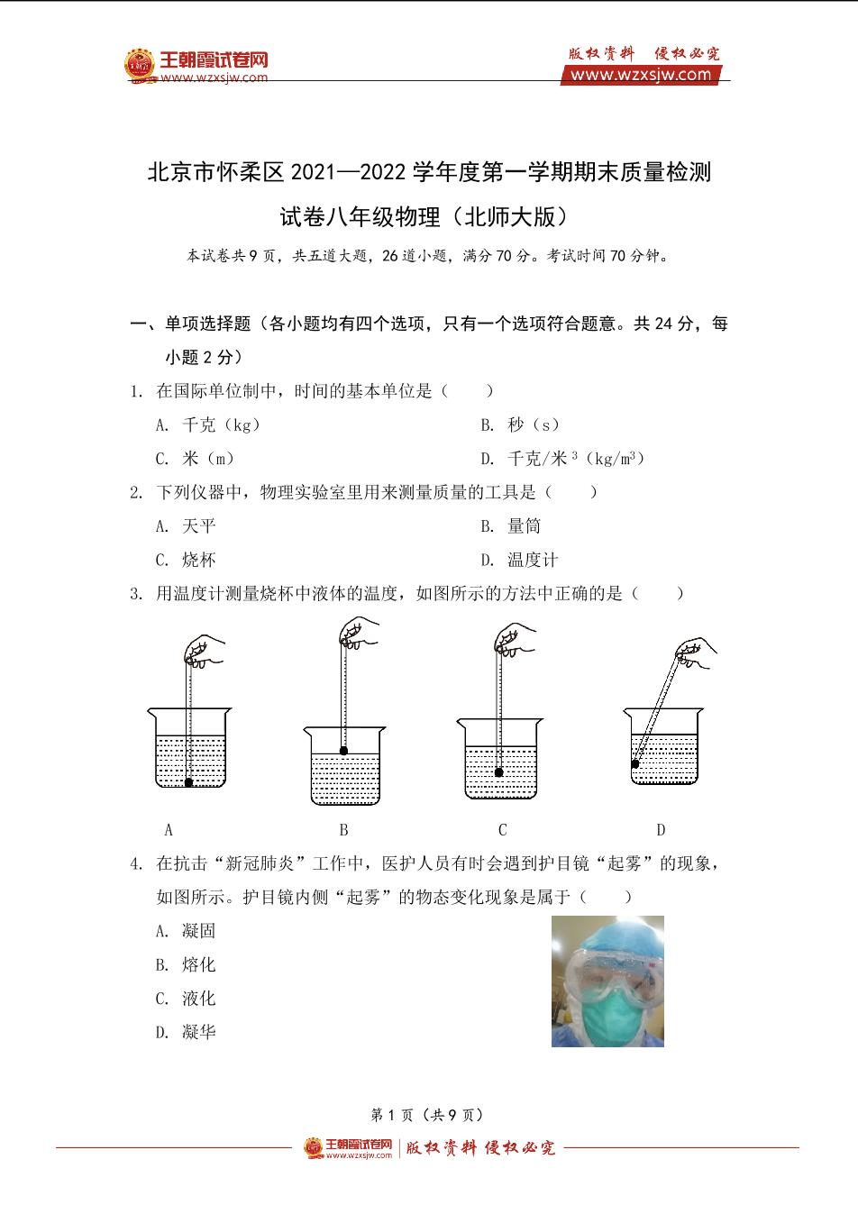 北京市怀柔区2021—2022学年度第一学期期末质量检测八年级物理(北师大版)