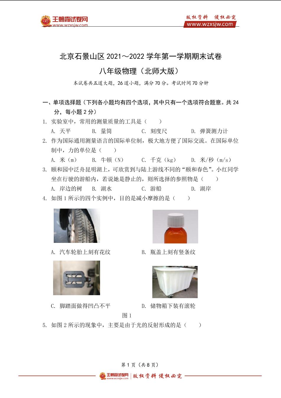北京石景山区2021~2022学年第一学期期末试卷八年级物理(北师大版)