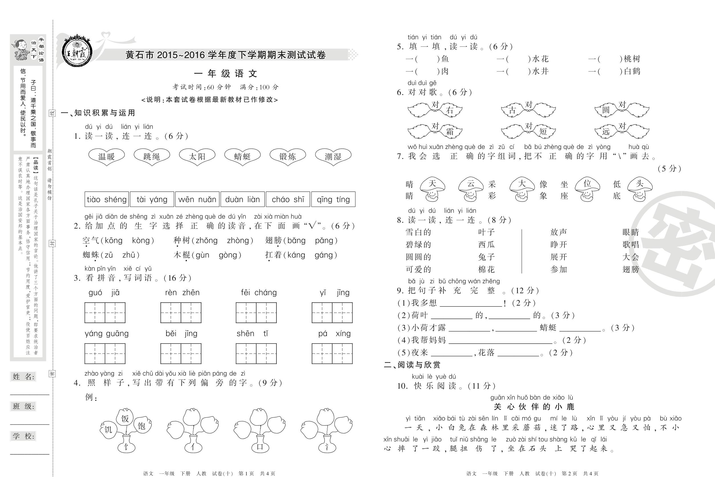 2015-2016学年第二学期黄石市一年级语文试卷(人教版)【10】