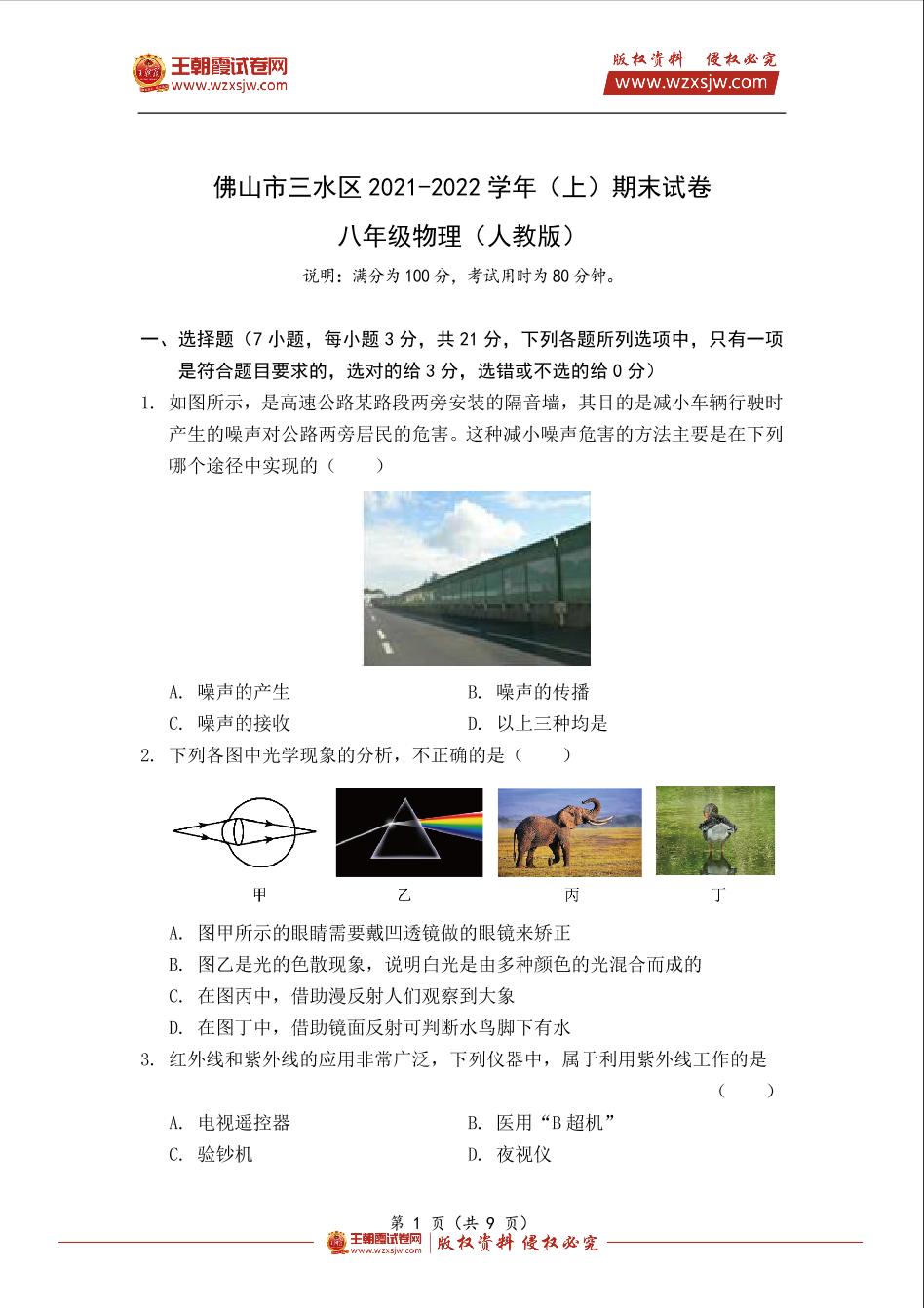 佛山市三水区2021-2022学年(上)期末试卷八年级物理(人教版)