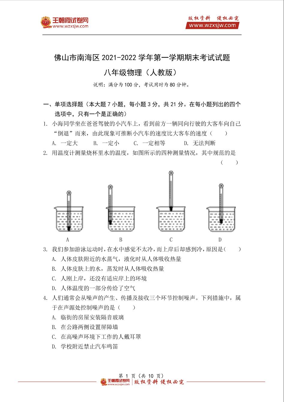 佛山市南海区2021-2022学年第一学期期末考试试题八年级物理(人教版)