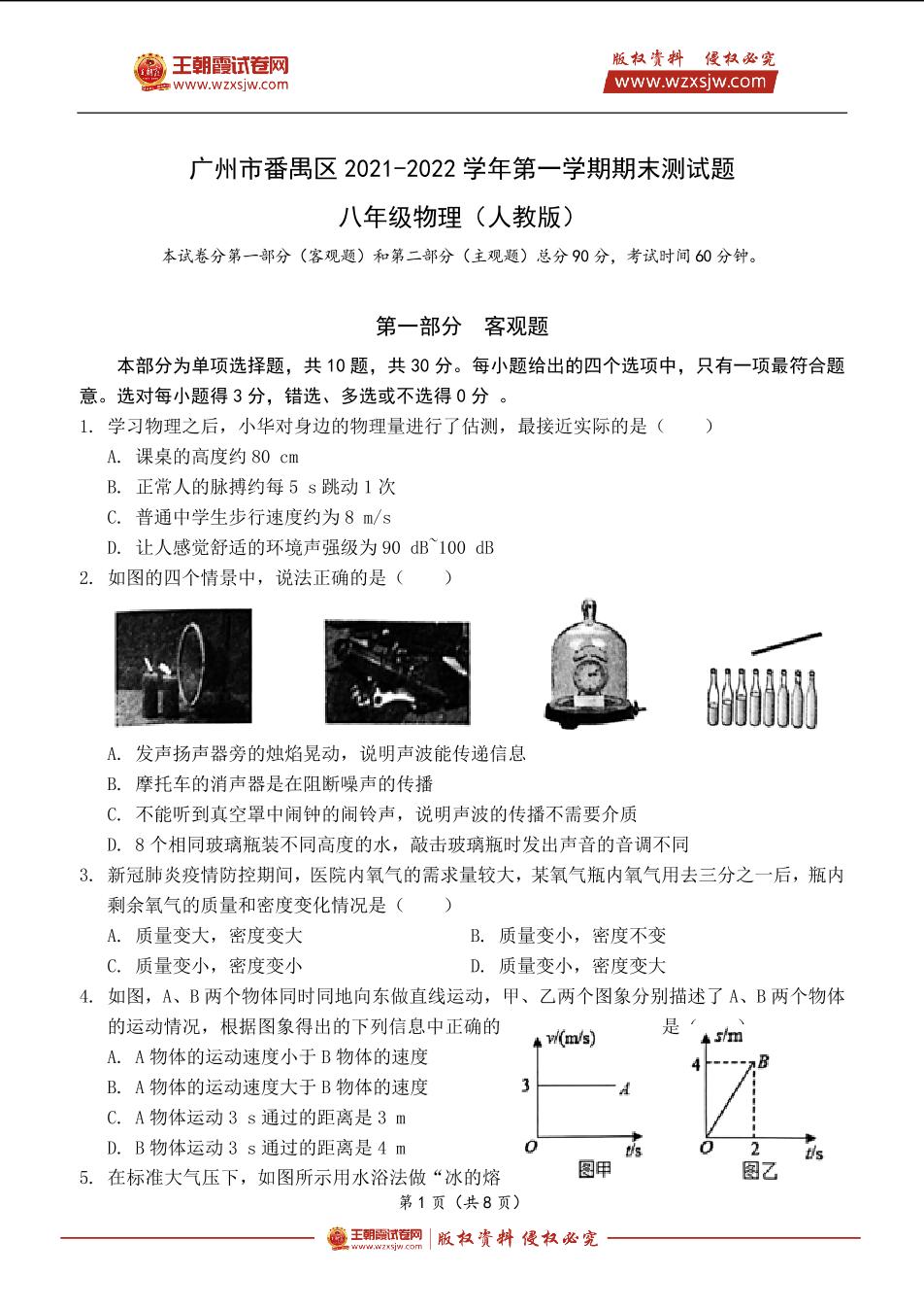 广州市番禺区2021—2022学年上学期初中八年级期末考试物理试卷(人教版)