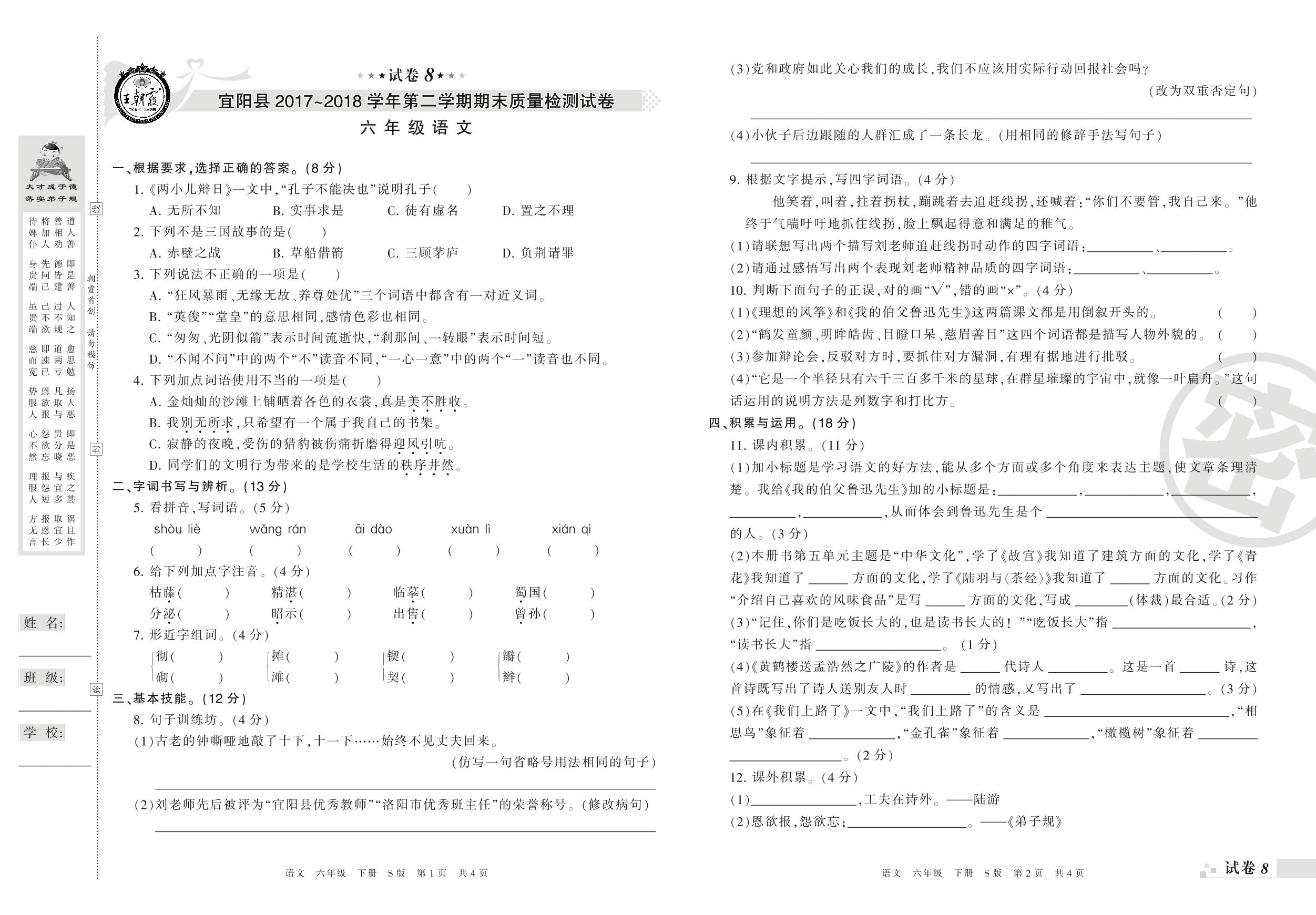 2017-2018学年第二学期洛阳市宜阳县六年级语文试卷(S版)【8】