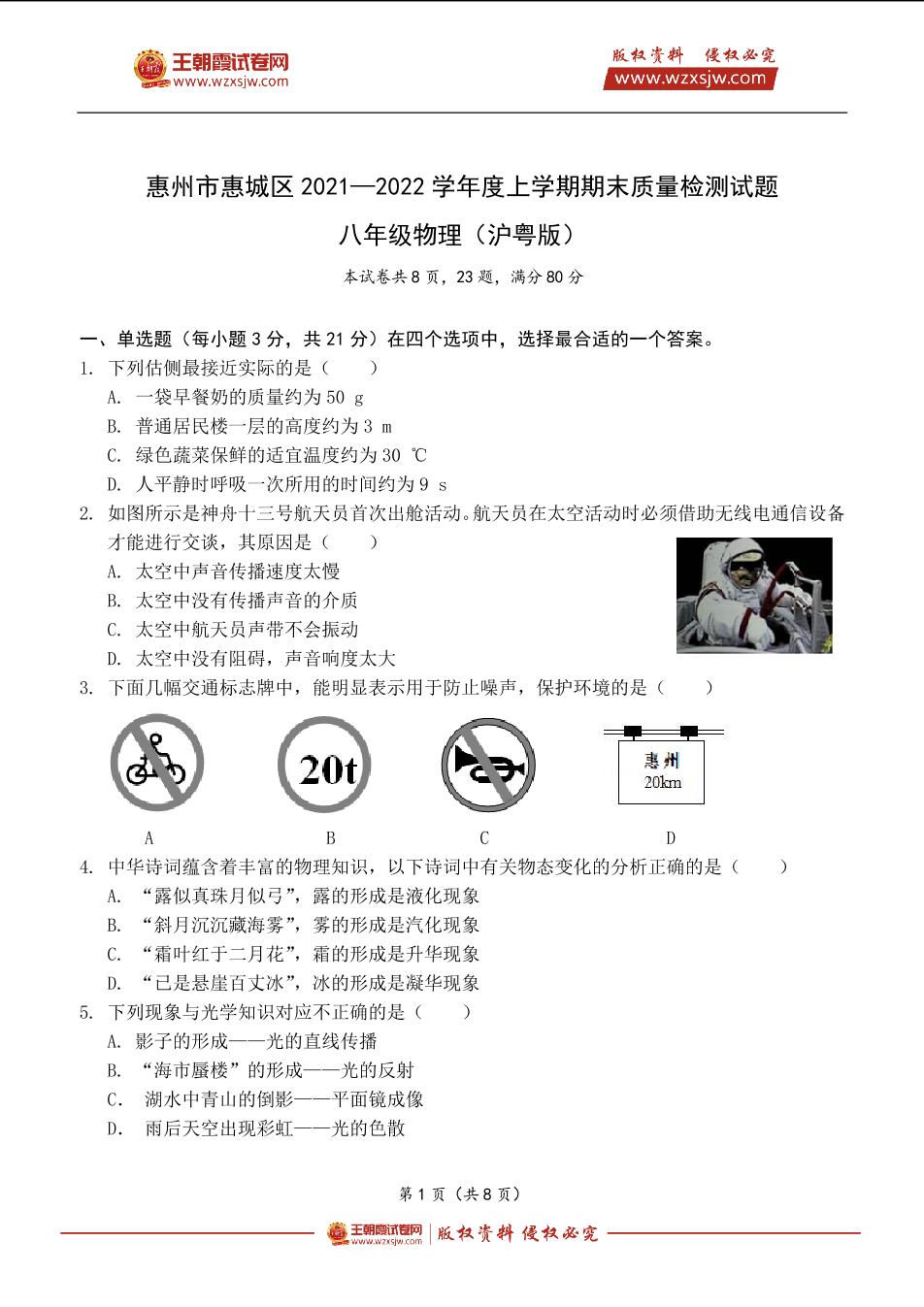 惠州市惠城区2021—2022学年上期期末质量检测试题八年级物理(沪粤版)