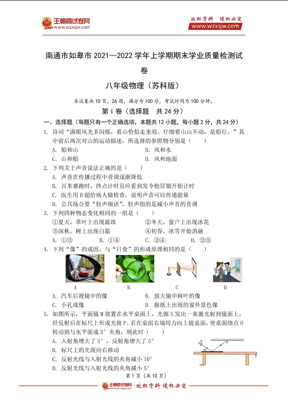 南通市如皋市2021—2022学年上学期期末学业质量检测试卷八年级物理(苏科版)