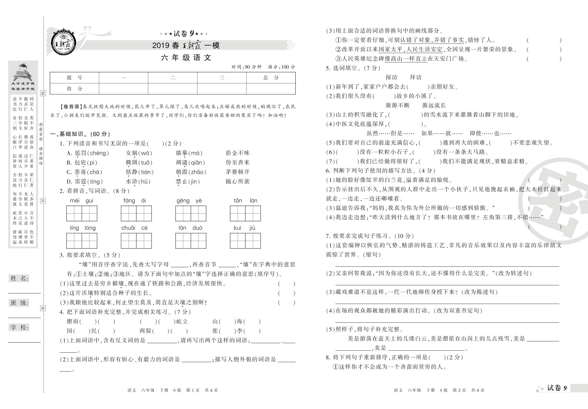 王朝霞期末模拟卷六年级下册语文(S版)_R21080230320【9】