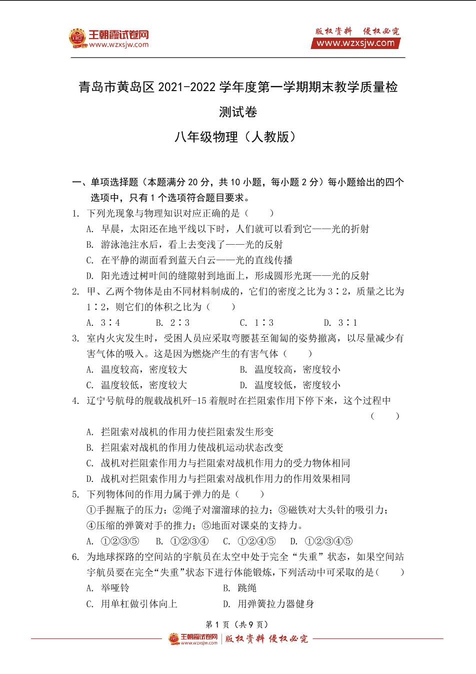 青岛市黄岛区2021—2022学年上学期初中八年级期末考试物理试卷(人教版)