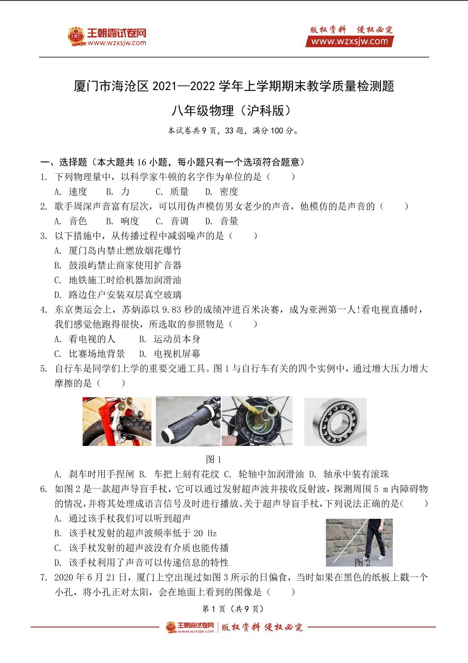 厦门市海沧区2021—2022学年上学期期末教学质量检测题八年级物理(沪科版)