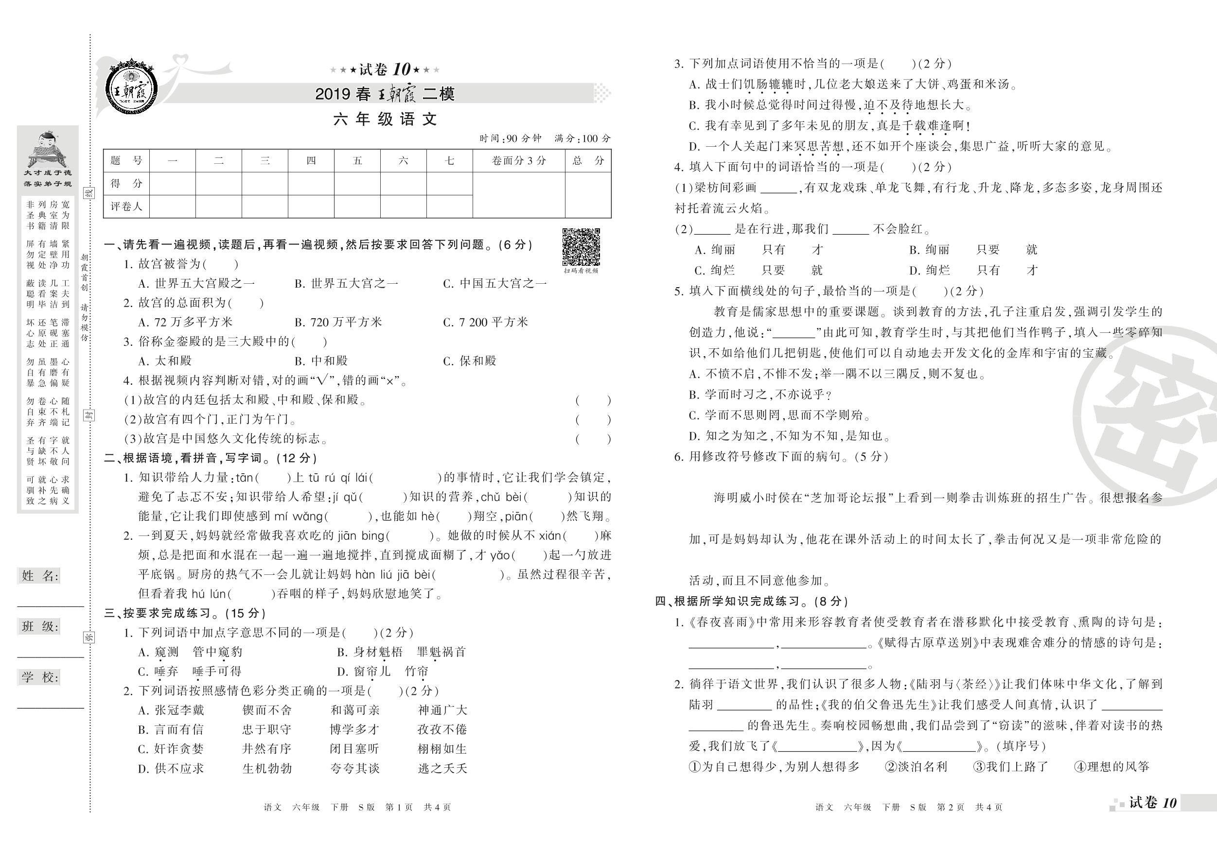 王朝霞期末模拟卷六年级下册语文(S版)_R21080230324【10】