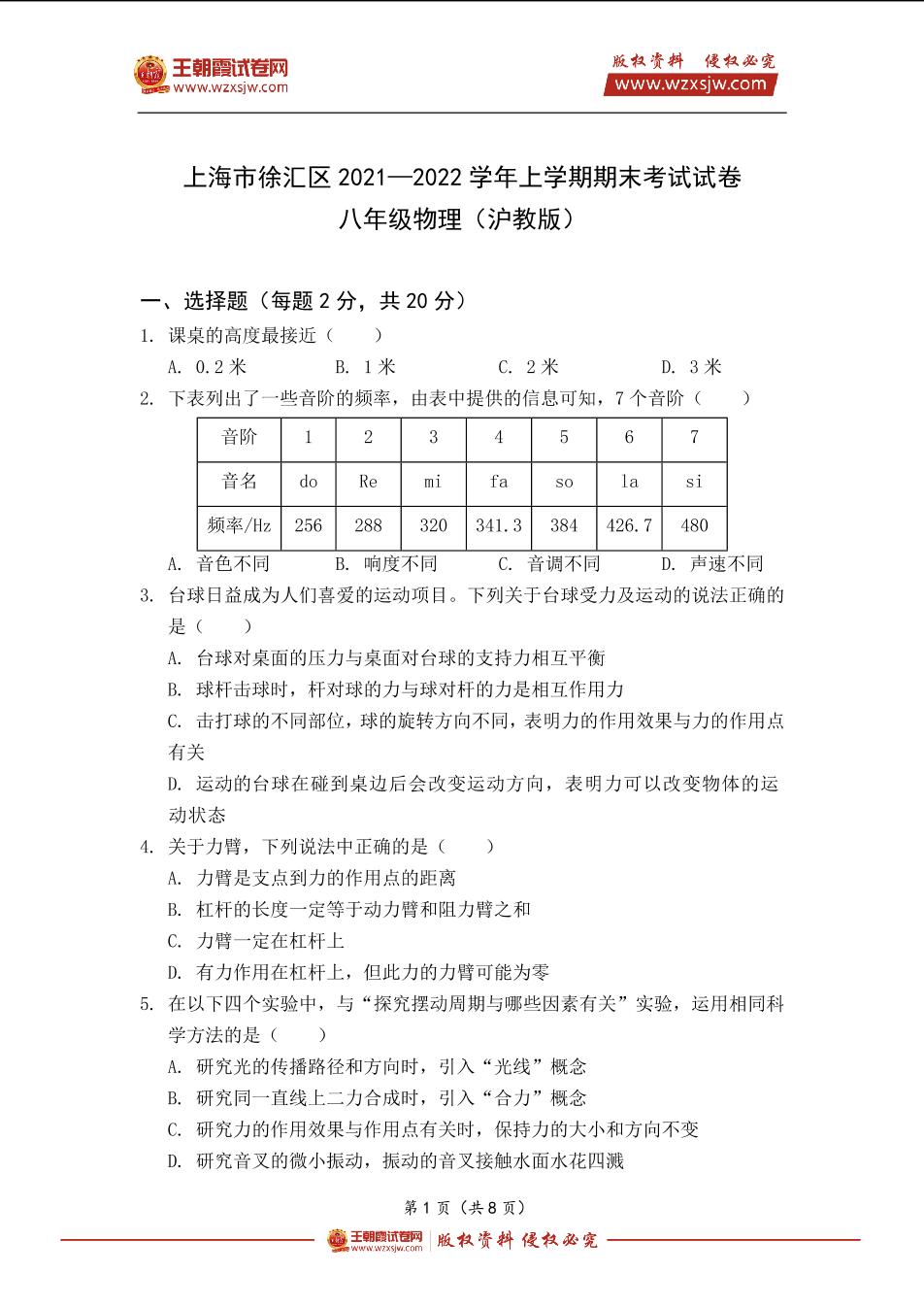 上海市徐汇区2021—2022学年上学期期末考试试卷八年级物理(沪教版)