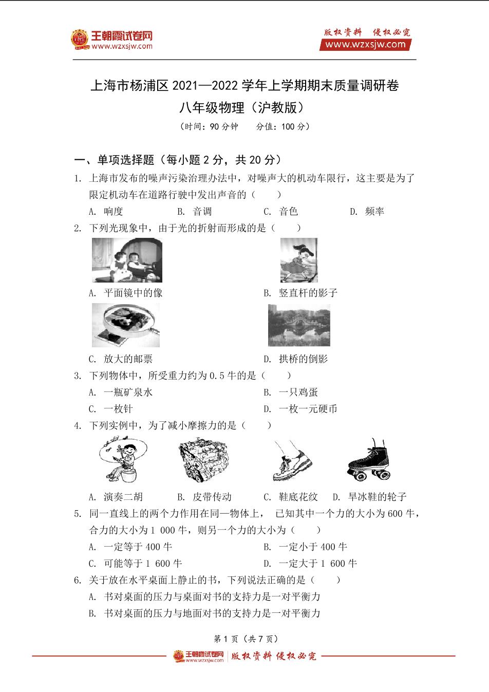 上海市杨浦区2021—2022学年上学期期末质量调研卷八年级物理(沪教版)