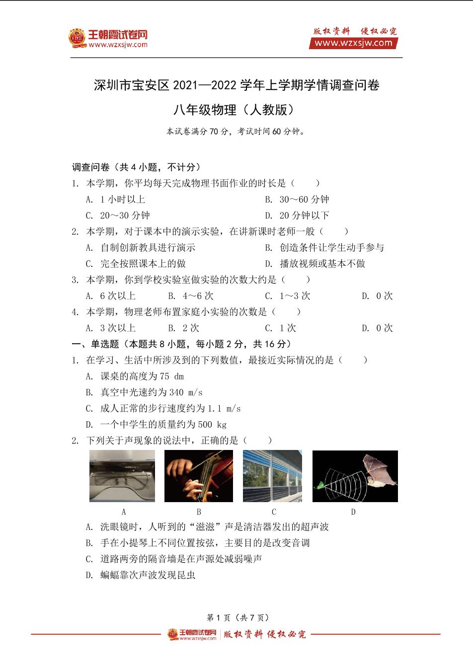 深圳市宝安区2021—2022学年上学期学情调查问卷八年级物理(人教版)