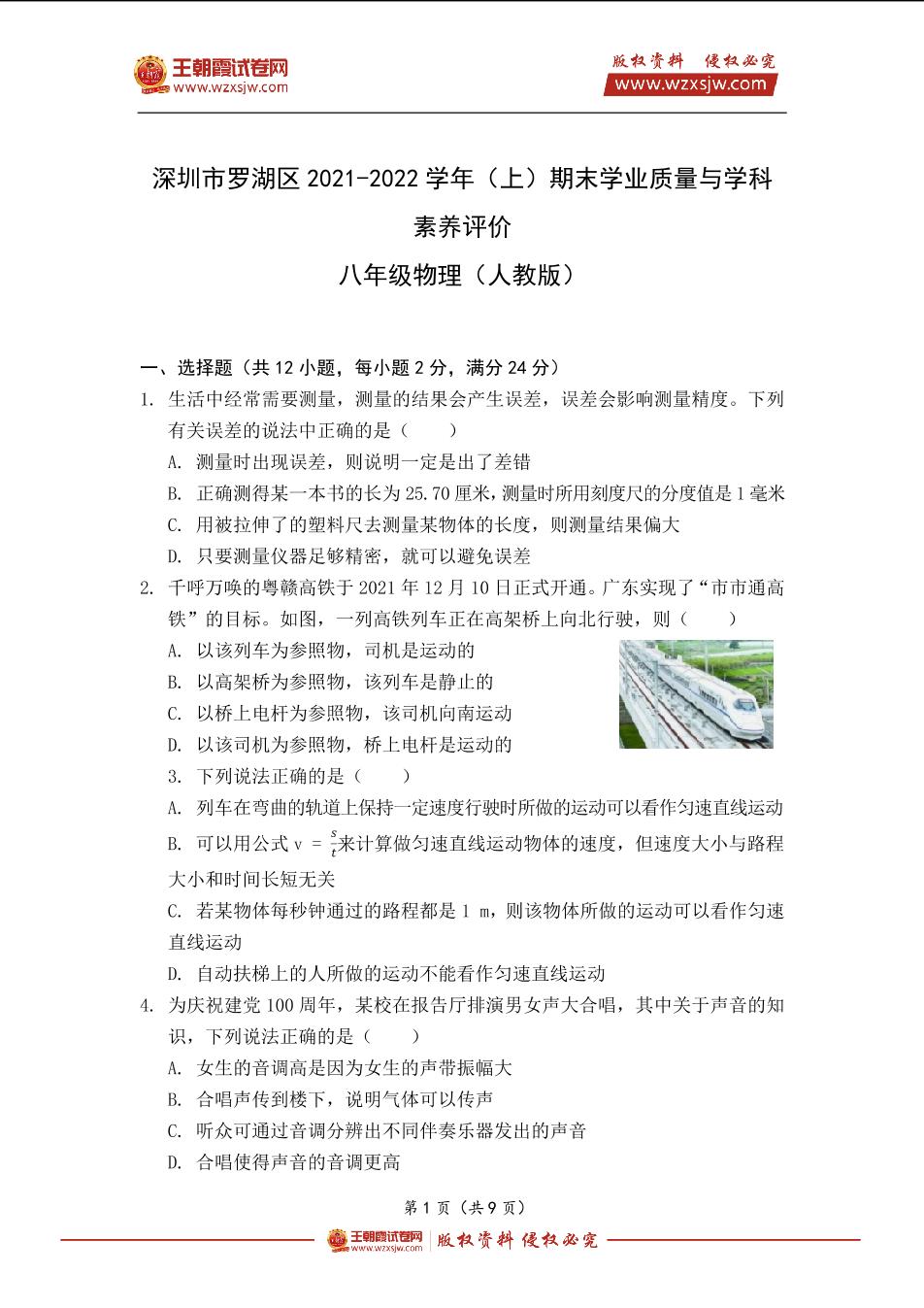 深圳市罗湖区2021—2022学年上学期期末学业质量与学科素养评价八年级物理(人教版)