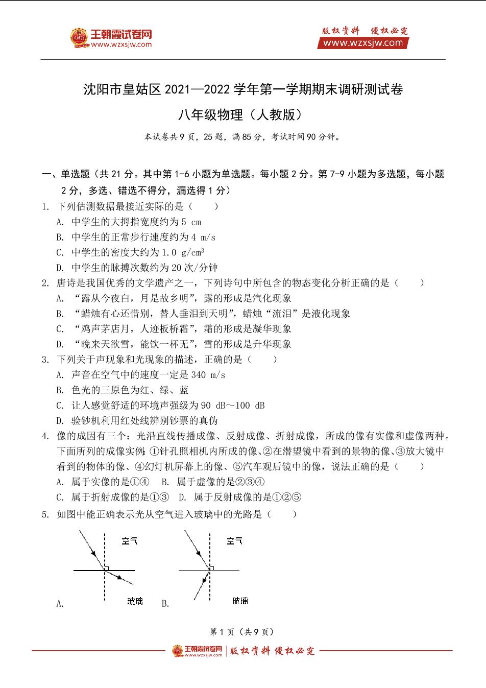 沈阳市皇姑区2021—2022学年第一学期期末调研测试卷八年级物理(人教版)