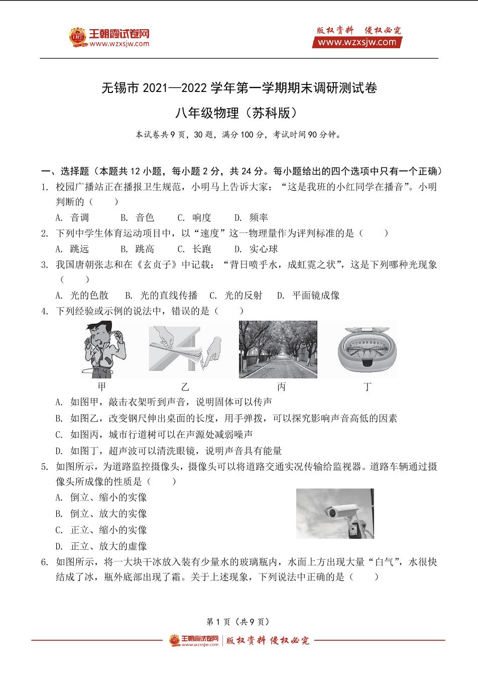 无锡市2021—2022学年第一学期期末调研测试卷八年级物理(苏科版)