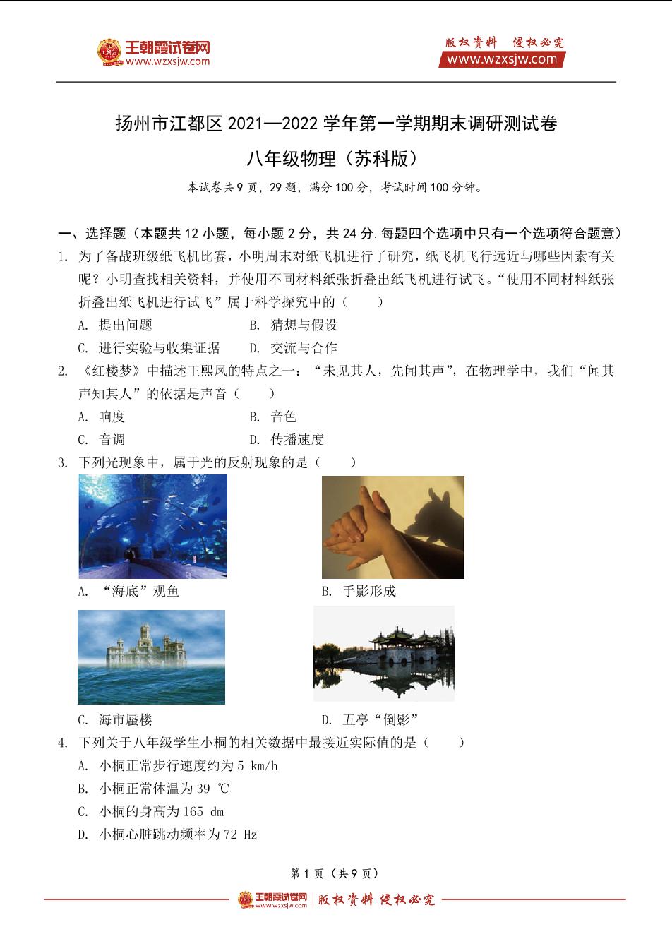 扬州市江都区2021—2022学年第一学期期末调研测试卷八年级物理(苏科版)
