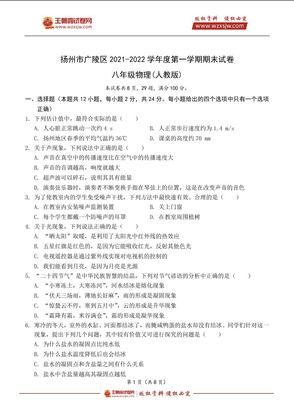 扬州市广陵区2021-2022学年度第一学期期末试卷八年级物理(人教版)