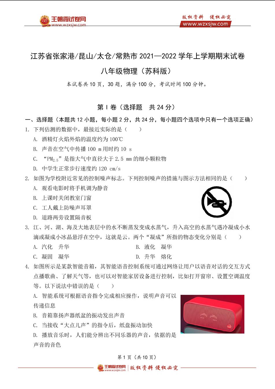 江苏省张家港、昆山、太仓、常熟市2021—2022学年上学期期末试卷八年级物理(苏科版)