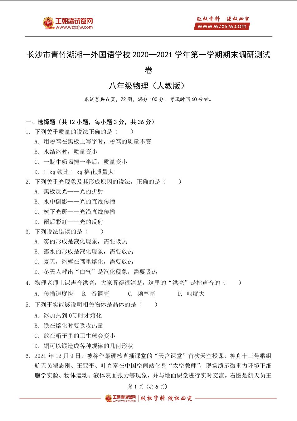 长沙市青竹湖湘一外国语学校2020—2021学年第一学期期末调研测试卷八年级物理(人教版)