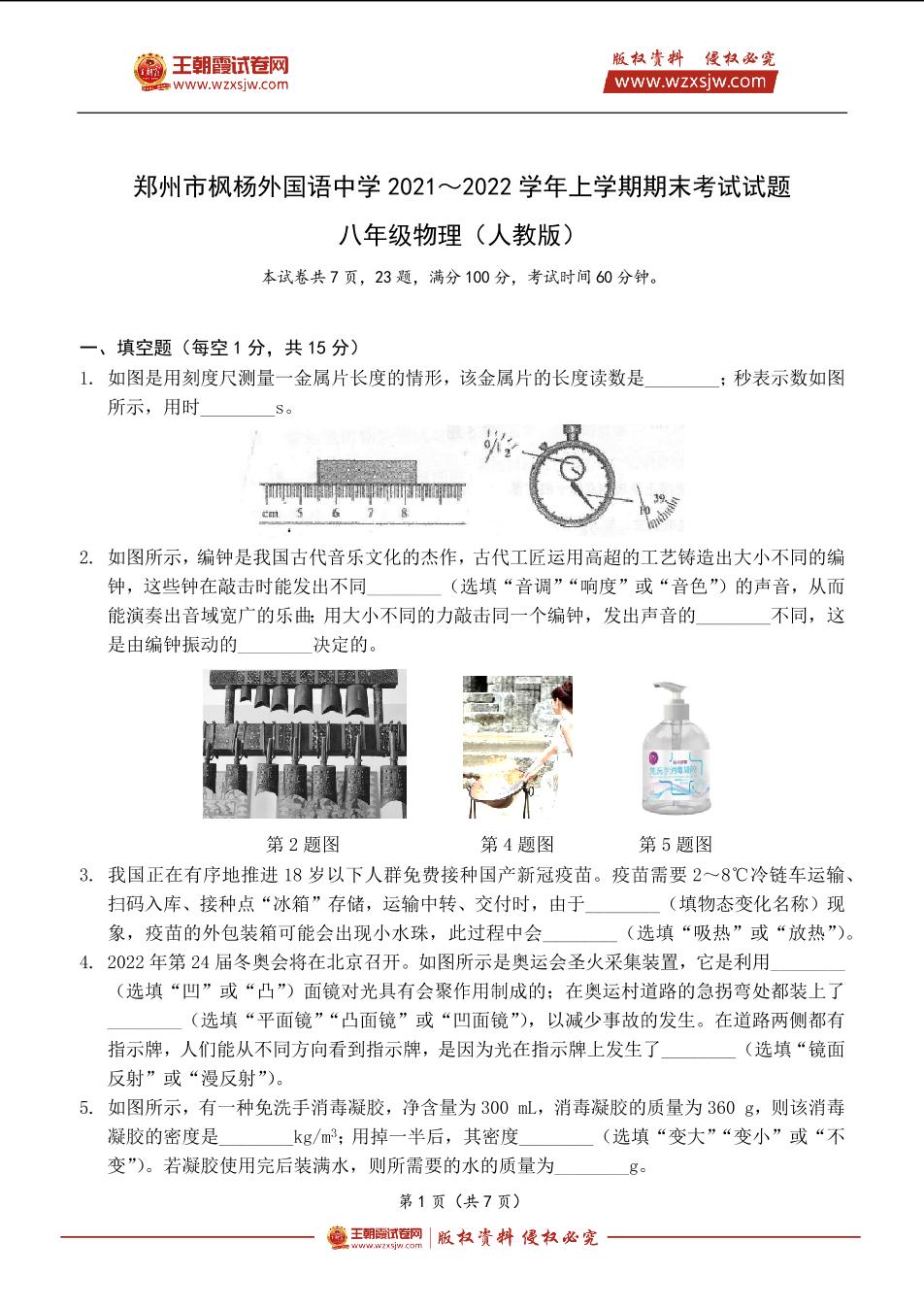 郑州市枫杨外国语中学2021~2022学年上学期期末考试试题八年级物理(人教版)