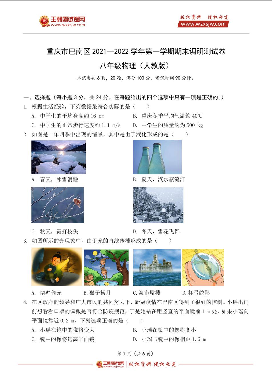 重庆市巴南区2021—2022学年第一学期期末调研测试卷八年级物理(人教版)