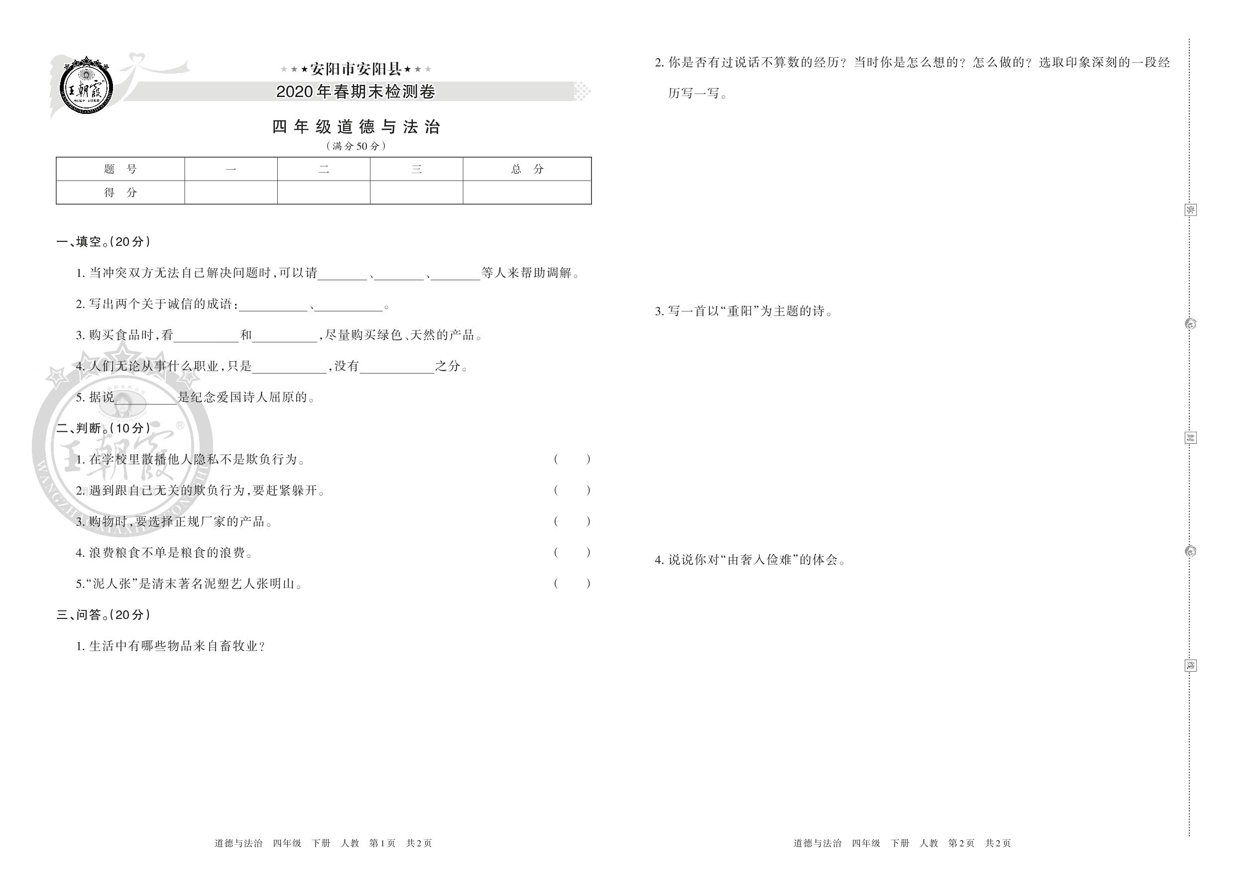 安阳市安阳县2020年春期末检测卷四年级道德与法治(人教版)