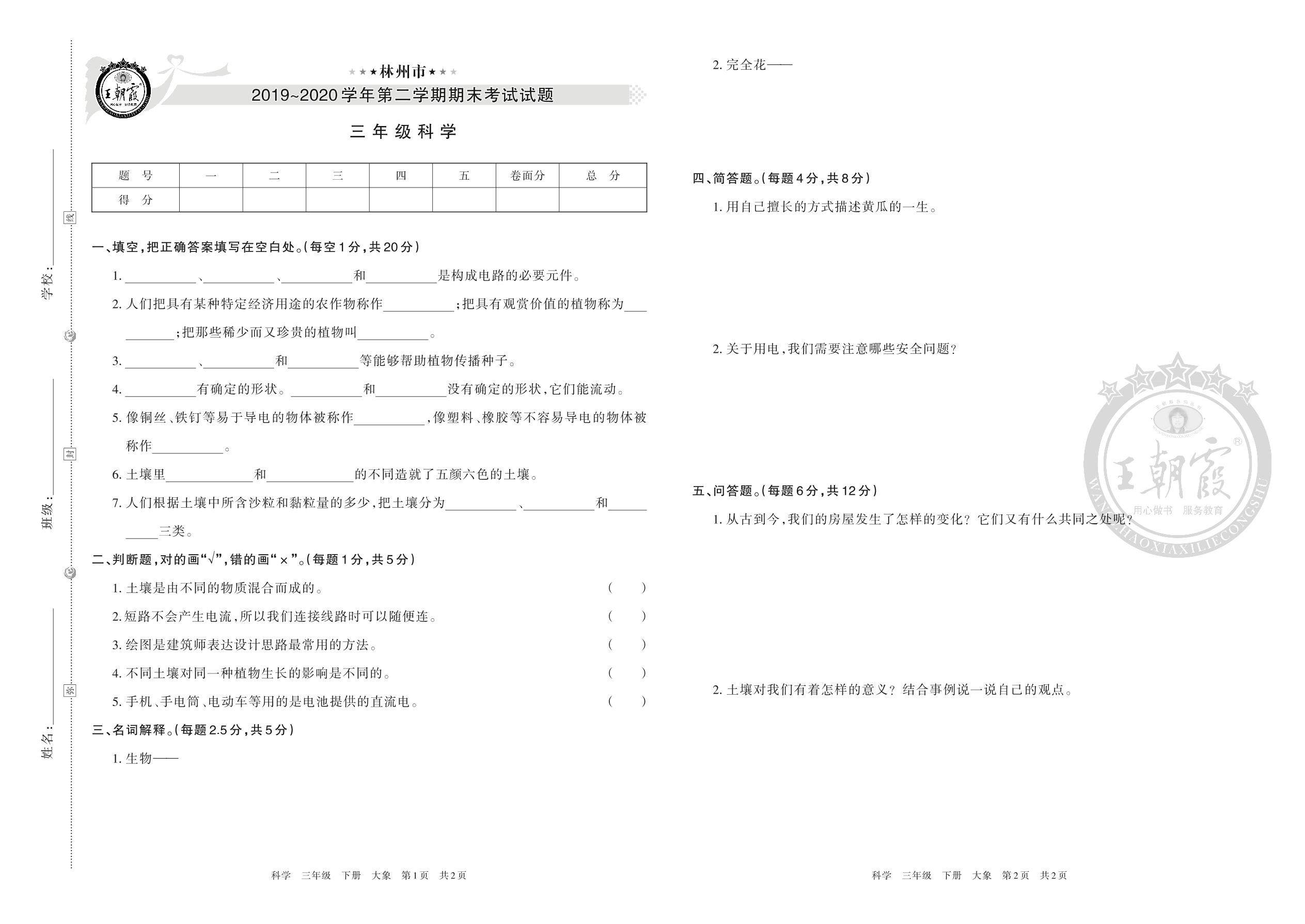 林州市2019~2020学年第二学期期末考试试题三年级科学(大象版)