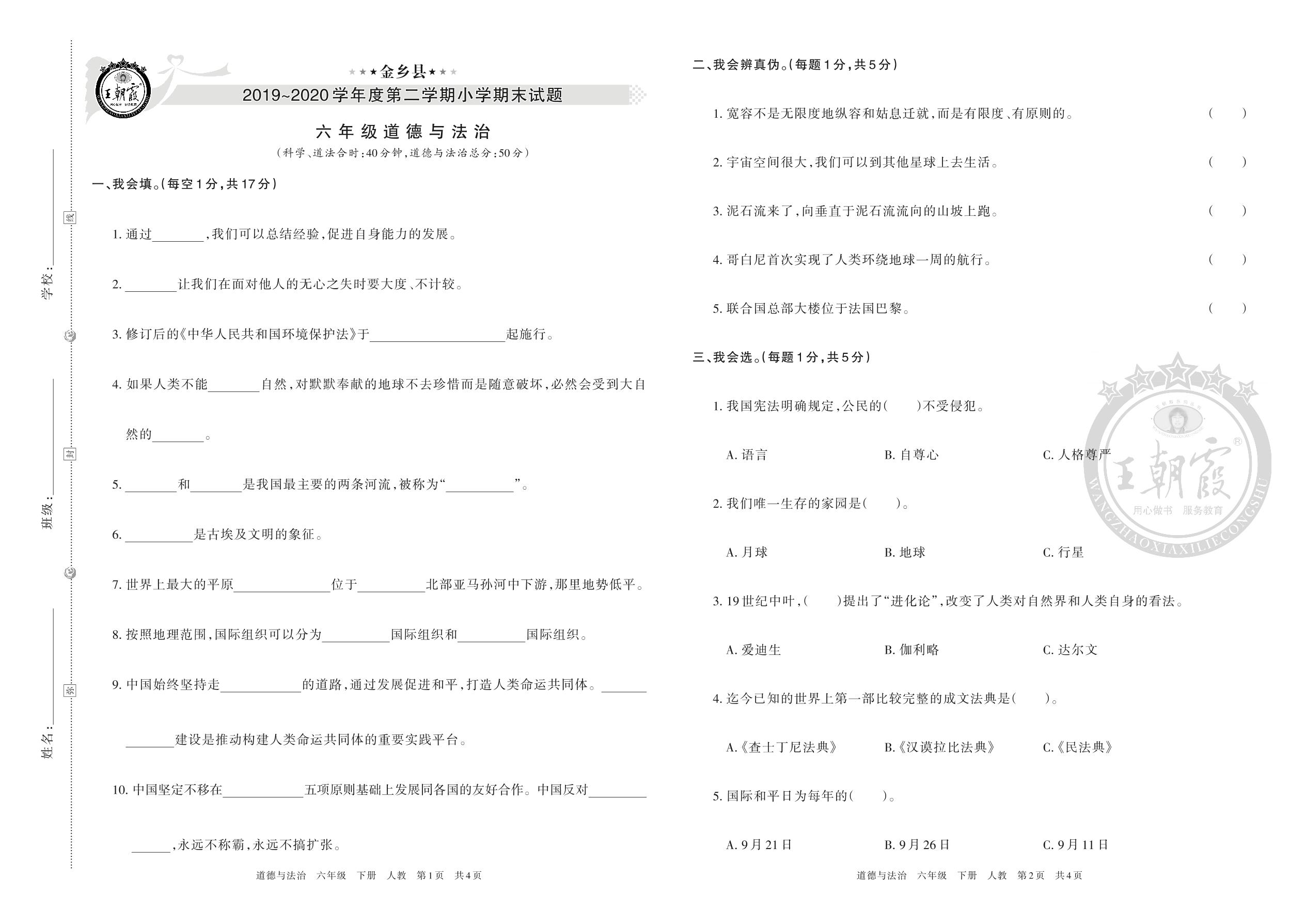 金乡县2019~2020学年度第二学期小学期末试题六年级道德与法治(人教版)