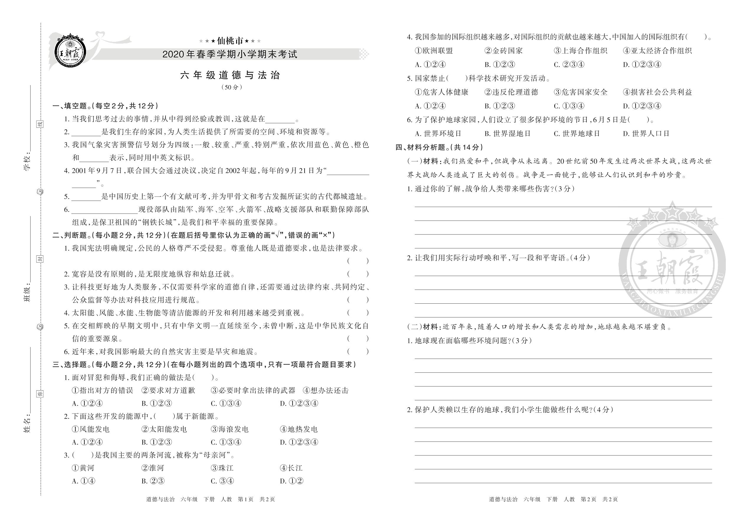 仙桃市2020年春季学期小学期末考试六年级道德与法治(人教版)