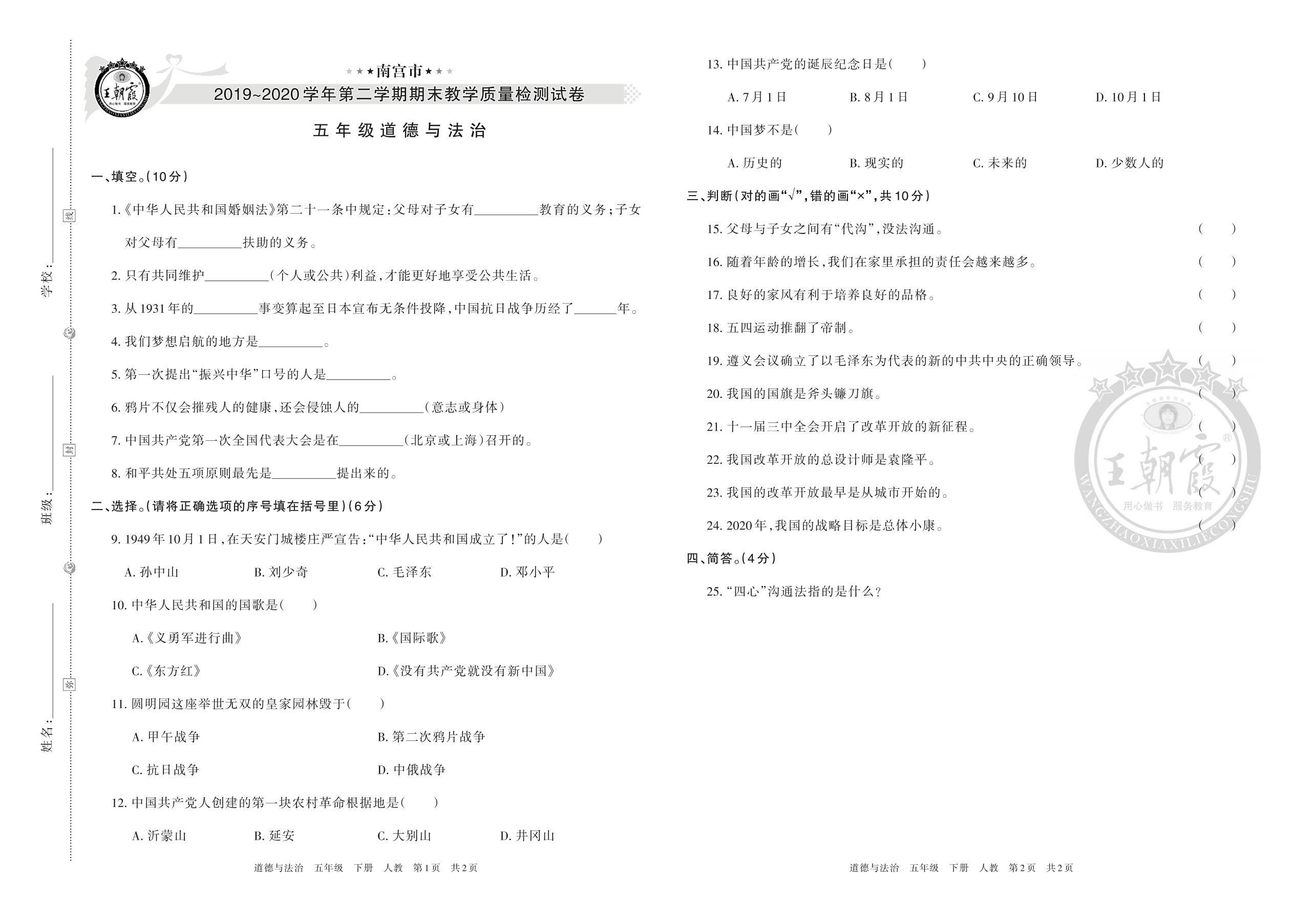 南宫市2019~2020学年第二学期期末教学质量检测试卷五年级道德与法治(人教版)