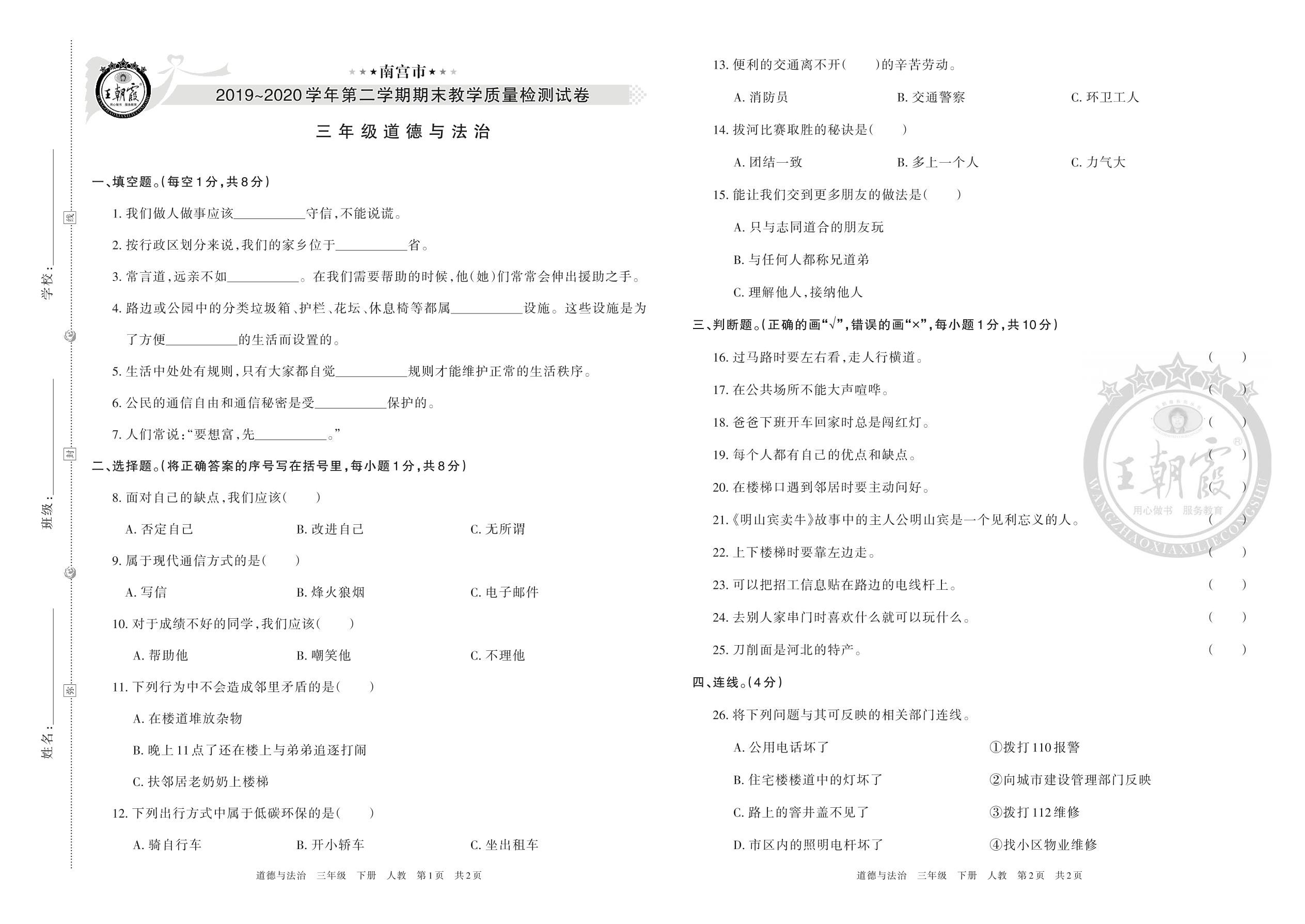南宫市2019~2020学年第二学期期末教学质量检测试卷三年级道德与法治(人教版)