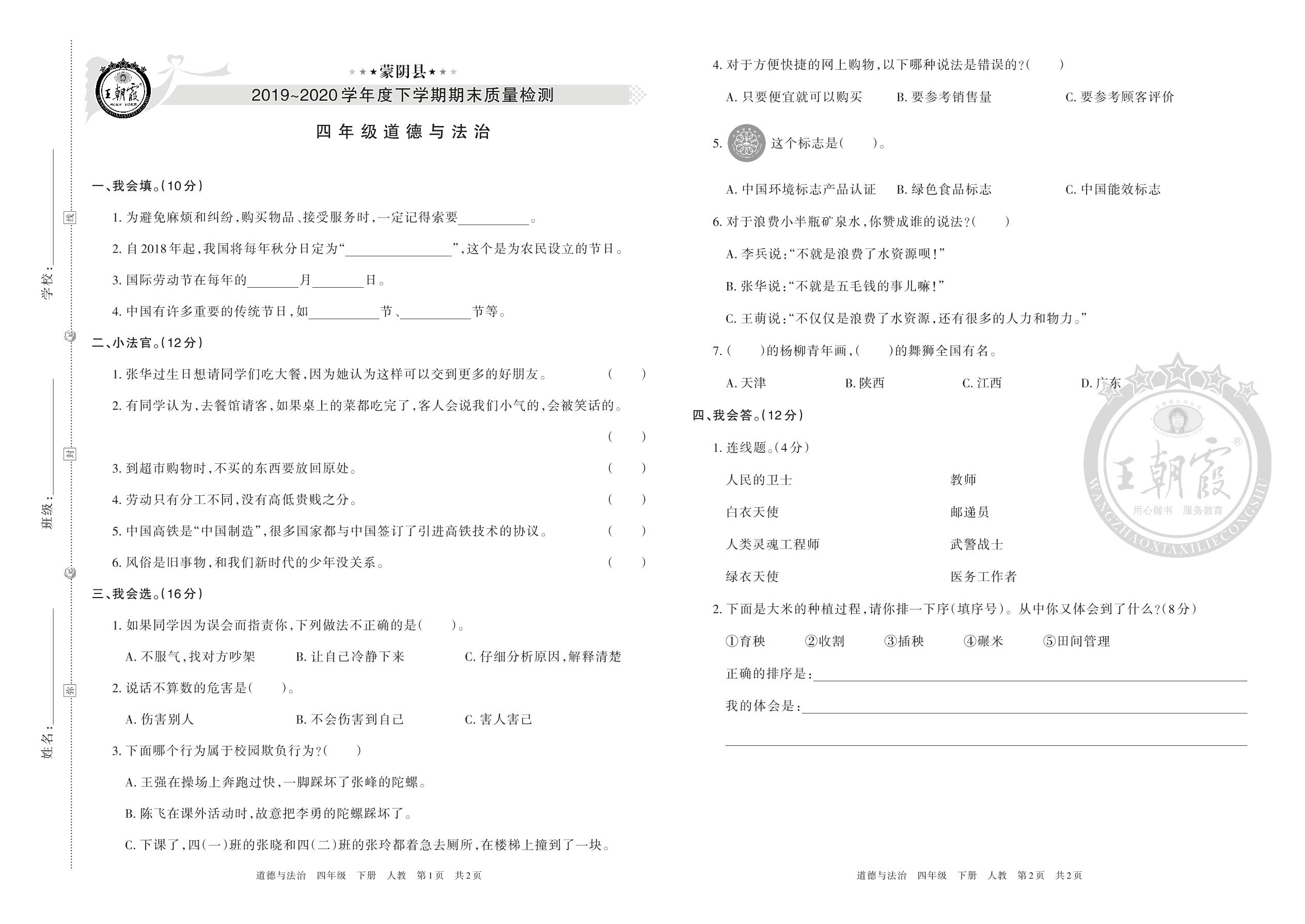 蒙阴县2019~2020学年度下学期期末质量检测四年级道德与法治(人教版)_R220516163418618