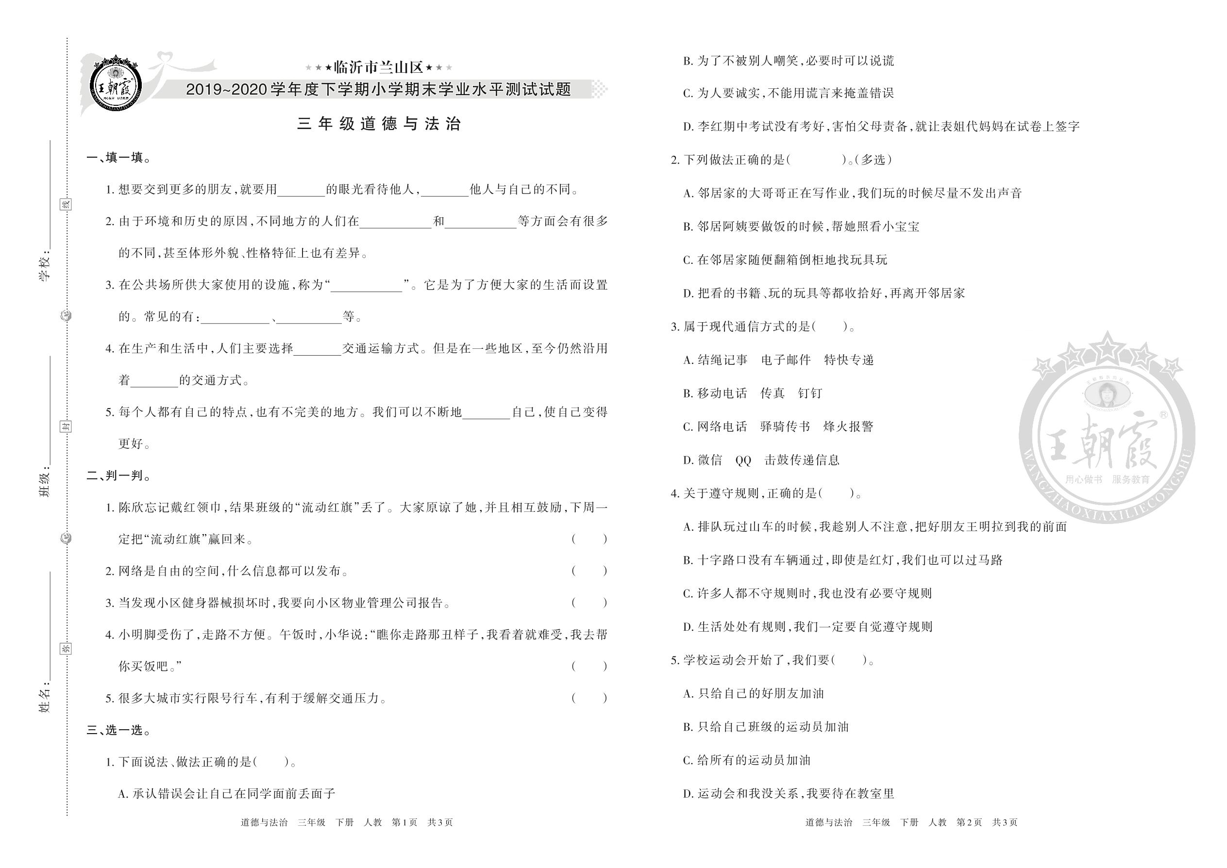 临沂市兰山区2019~2020学年度下学期小学期末学业水平测试试题三年级道德与法治(人教版)