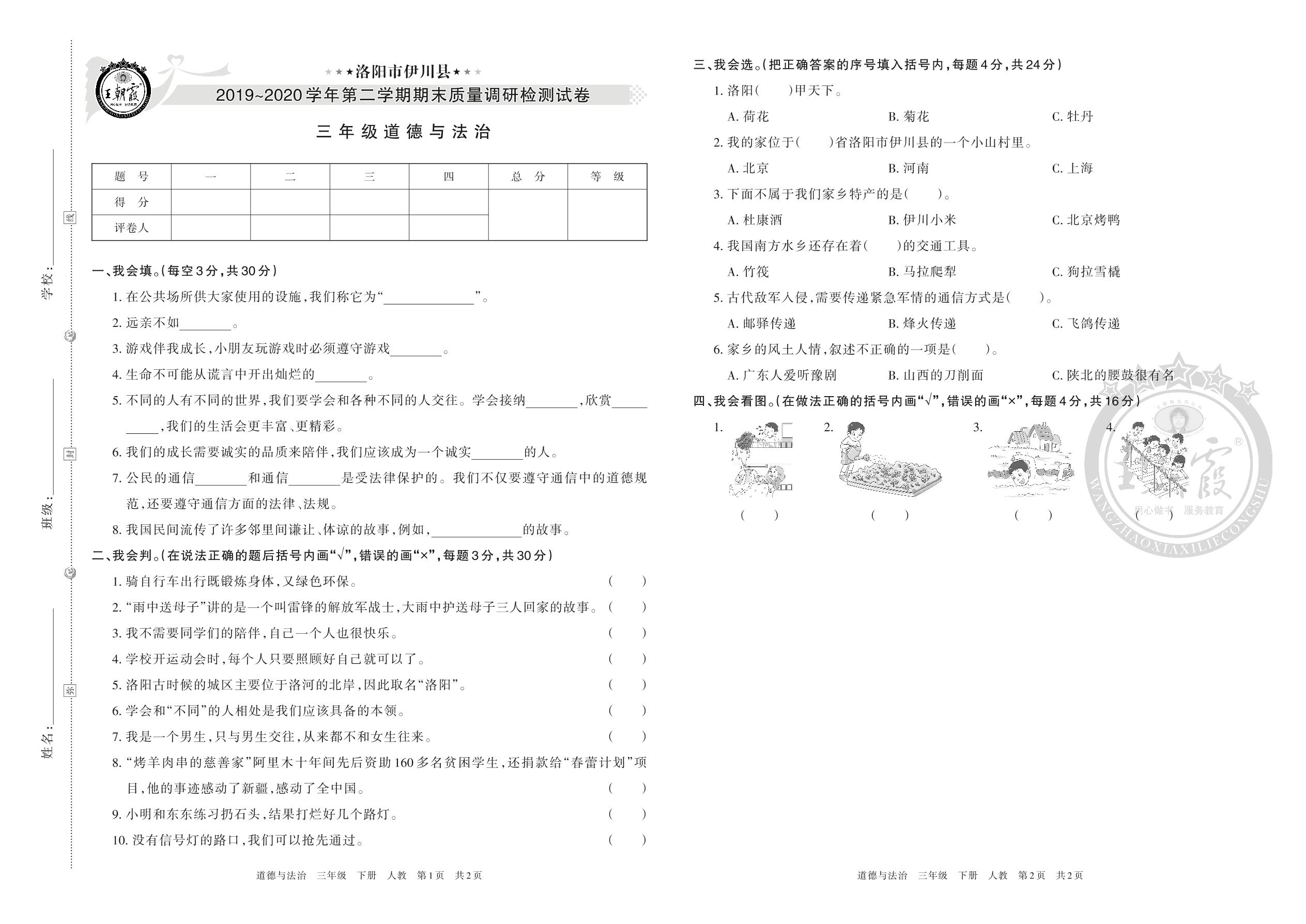 洛阳市伊川县2019~2020学年第二学期期末质量调研检测试卷三年级道德与法治(人教版)