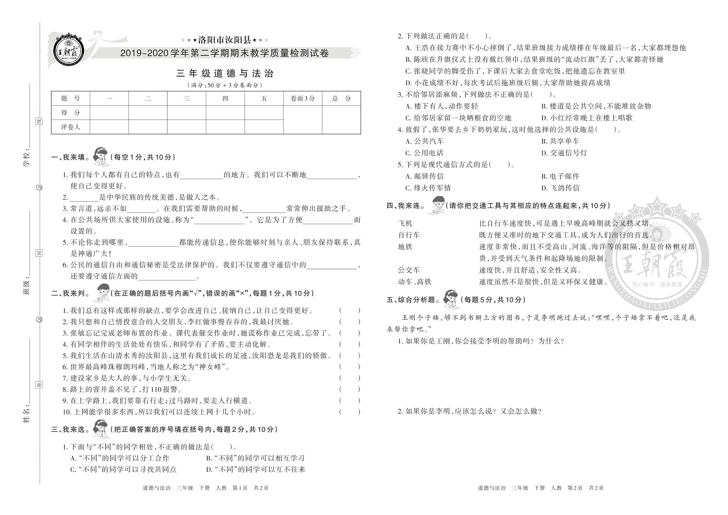 洛阳市汝阳县2019~2020学年第二学期期末教学质量检测试卷三年级道德与法治(人教版)