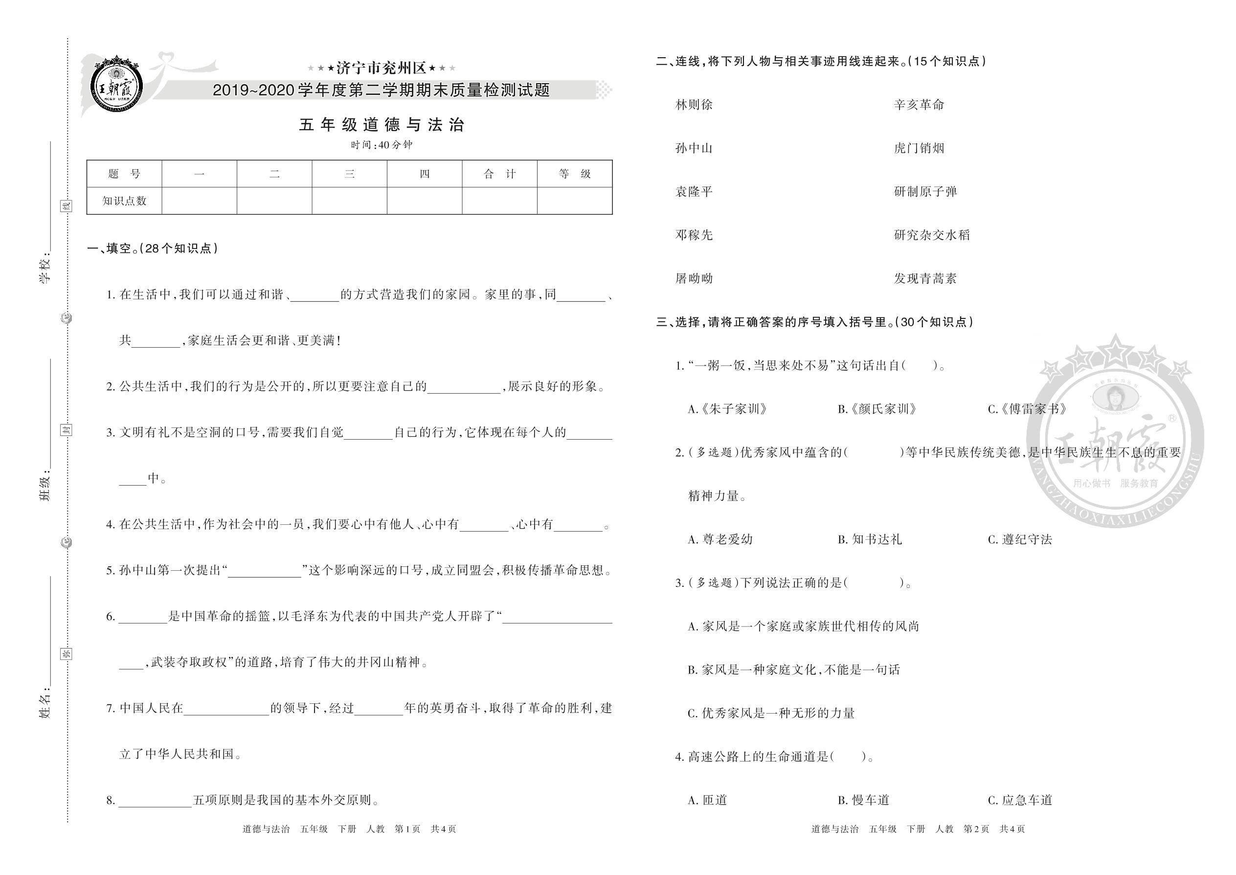 济宁市兖州区2019~2020学年度第二学期期末质量检测试题五年级道德与法治(人教版)