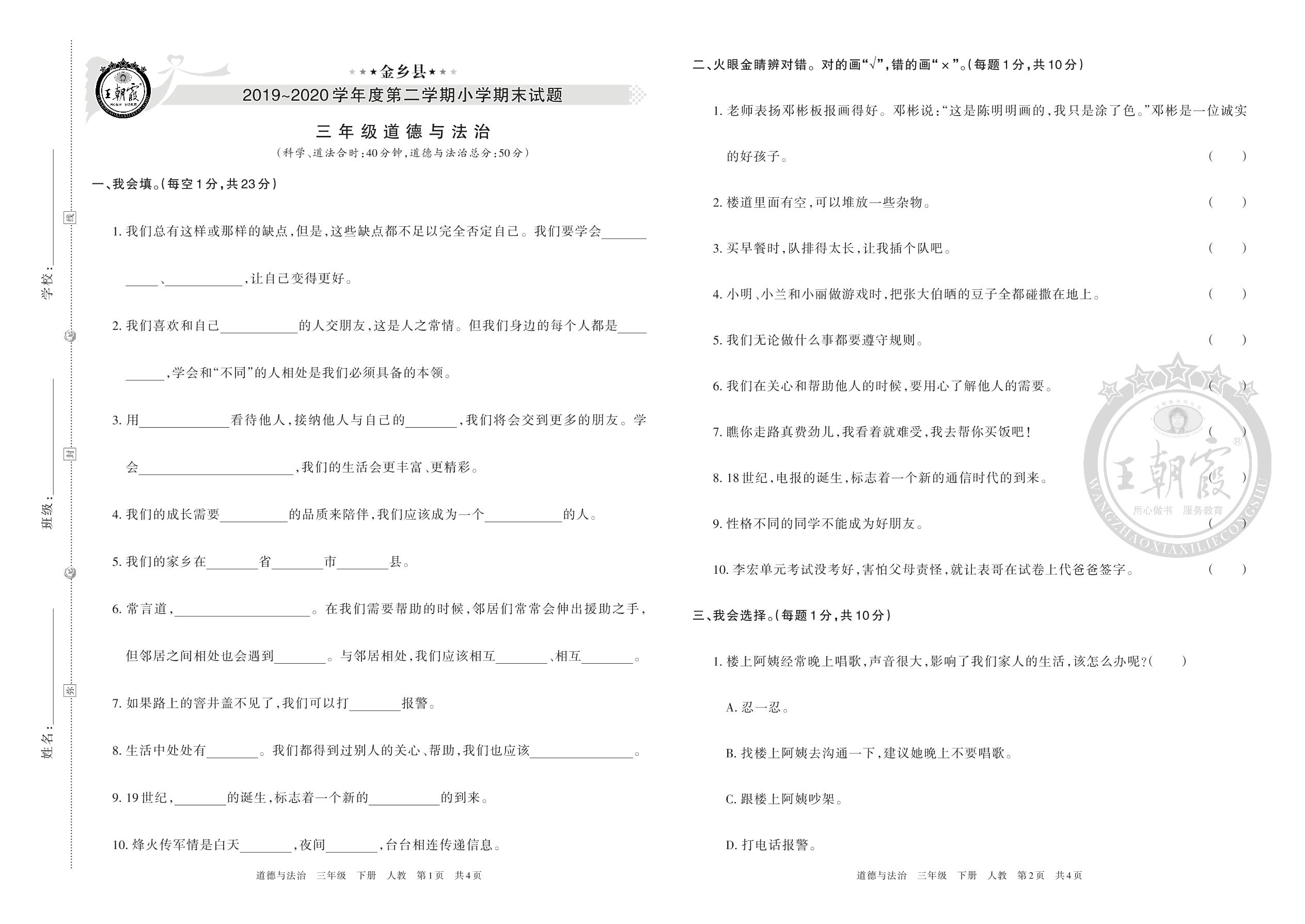 金乡县2019~2020学年度第二学期小学期末试题三年级道德与法治(人教版)