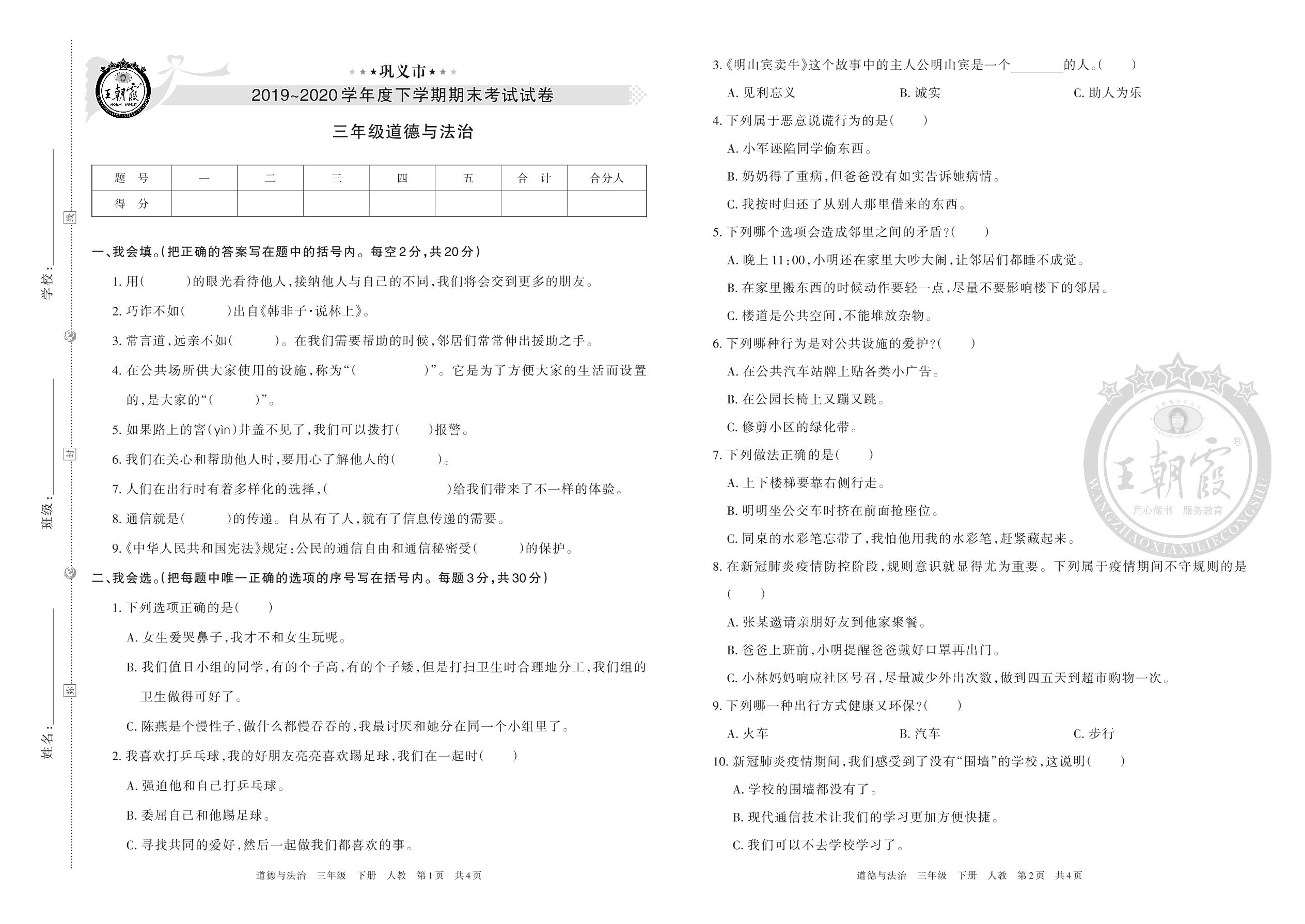 巩义市2019-2020学年度下学期期末考试试卷三年级道德与法治(人教版)