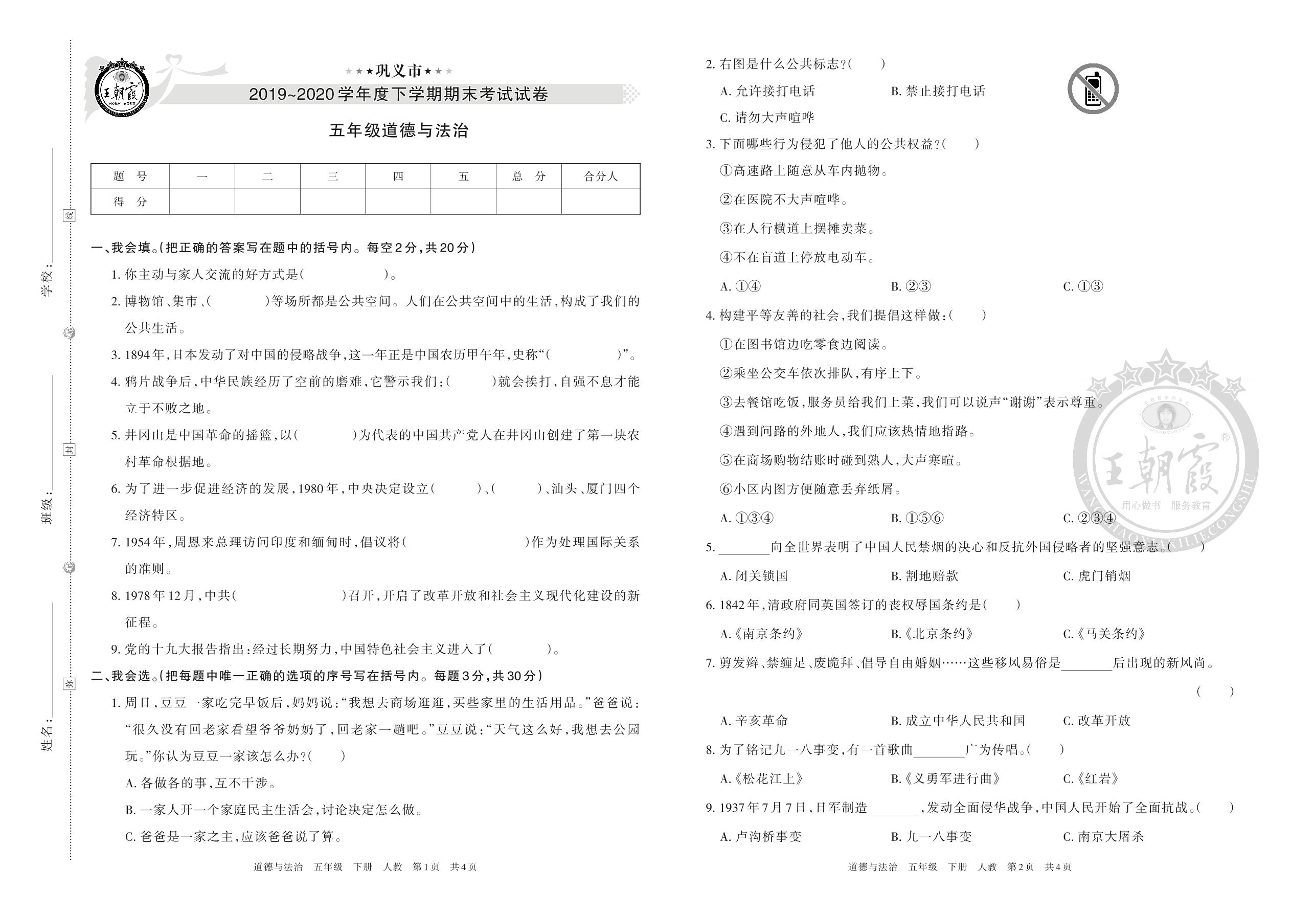 巩义市2019-2020学年度下学期期末考试试卷五年级道德与法治(人教版)