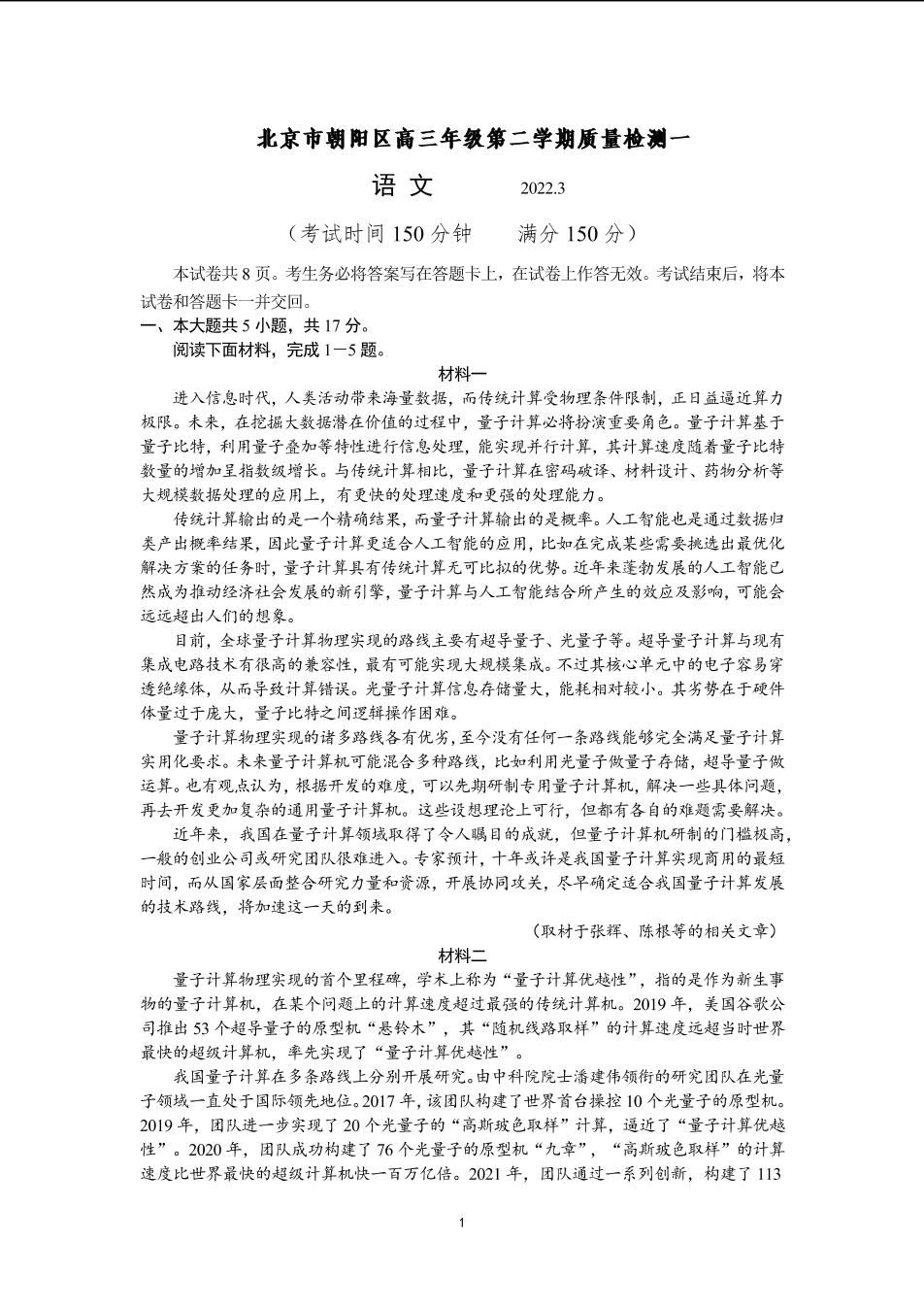 北京市朝阳区2022年高考第一次模拟测试试卷语文