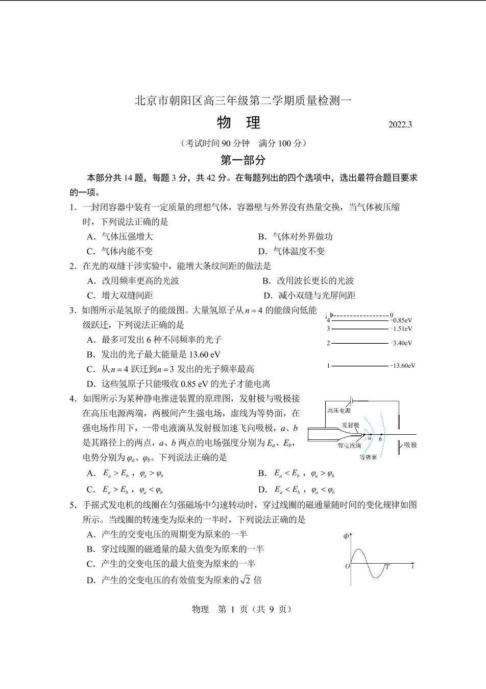 北京市朝阳区2022年高考第一次模拟测试试卷物理
