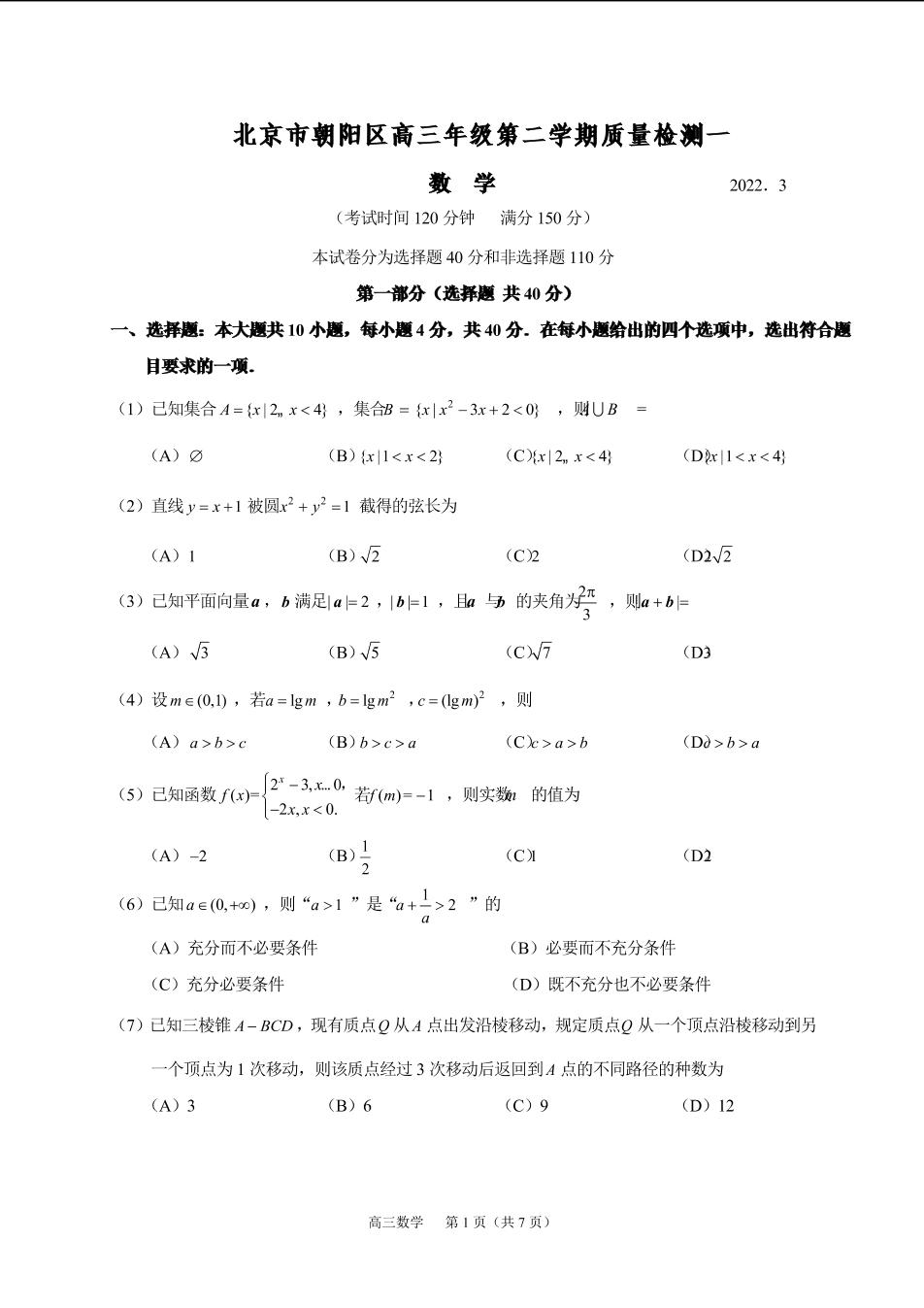 北京市朝阳区2022年高考第一次模拟测试试卷数学