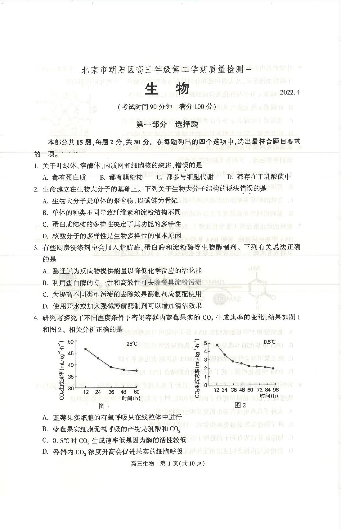 北京市朝阳区2022年高考第一次模拟测试试卷生物