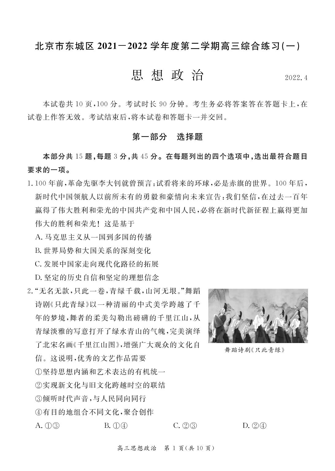 北京市东城区2022年高考第一次模拟测试试卷思想政治