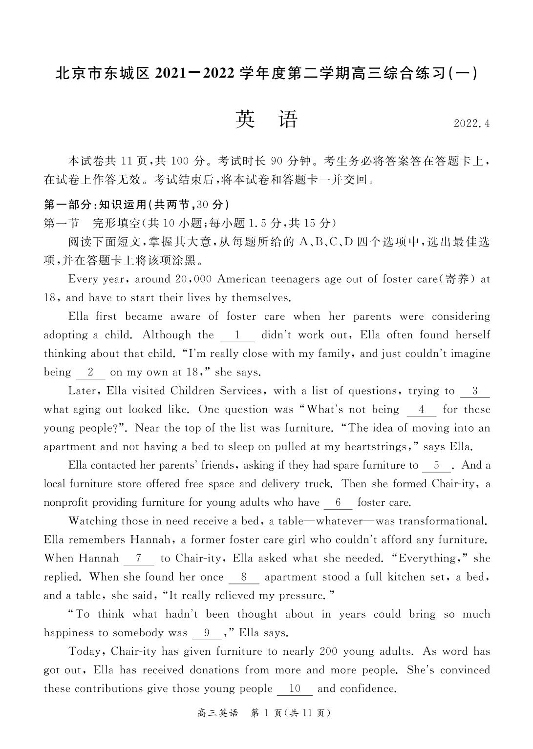北京市东城区2022年高考第一次模拟测试试卷英语【无听力音频】