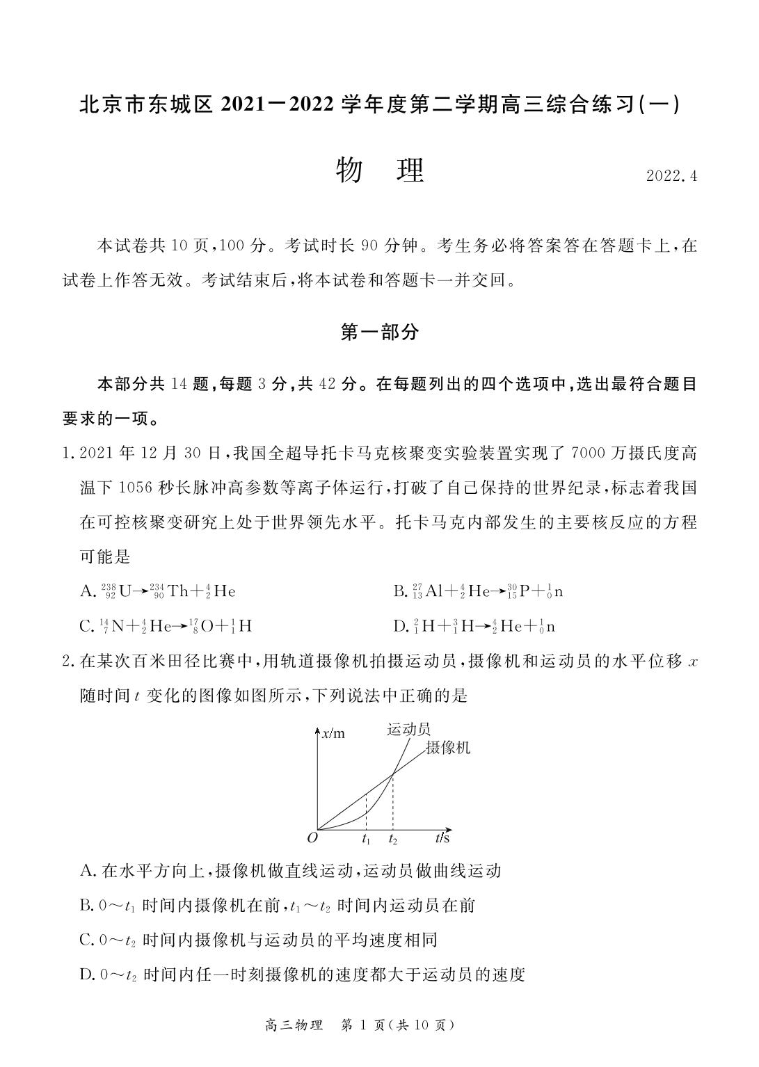 北京市东城区2022年高考第一次模拟测试试卷物理