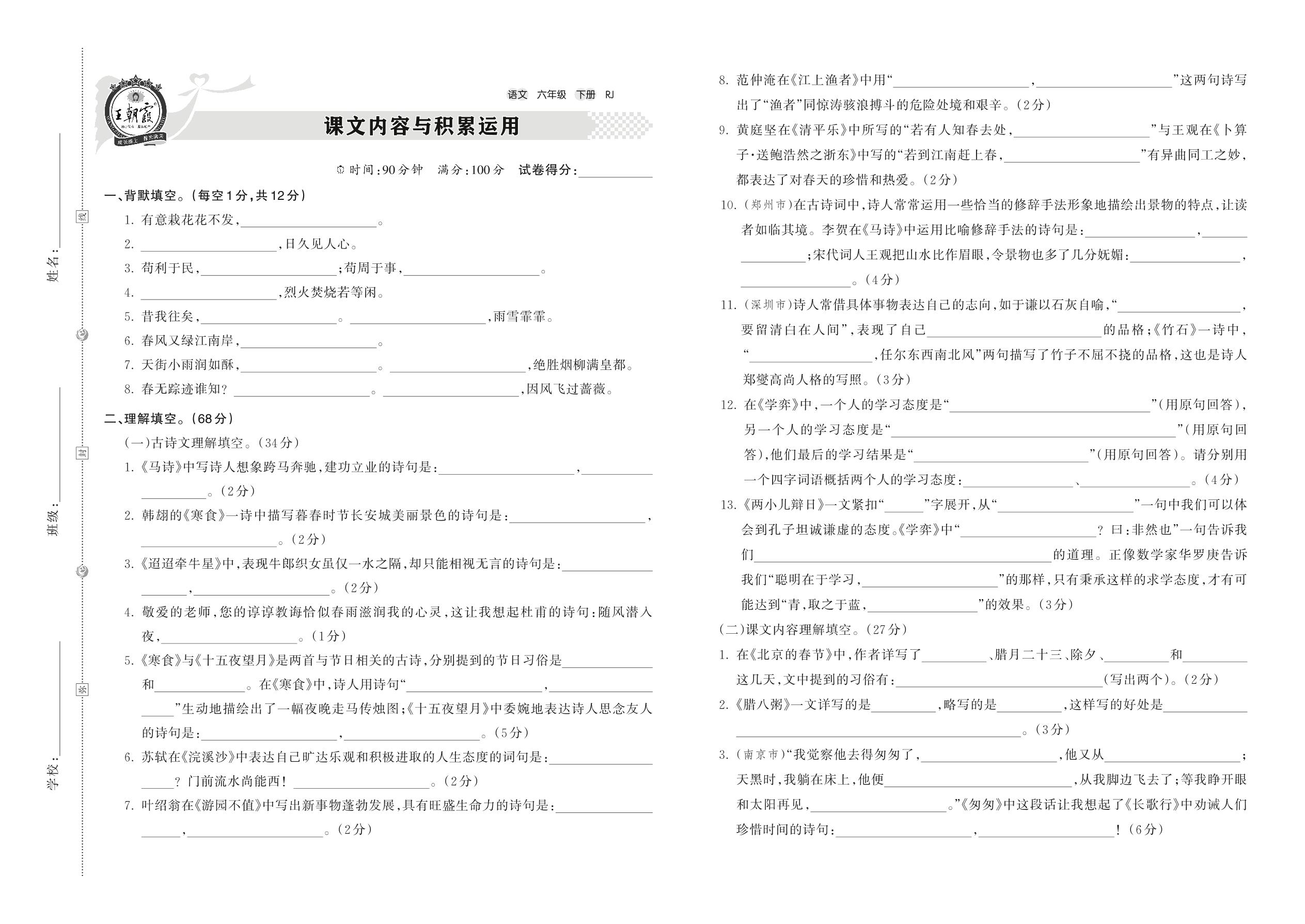 【易考突破】人教版·六年级·语文课文内容与积累运用专项训练
